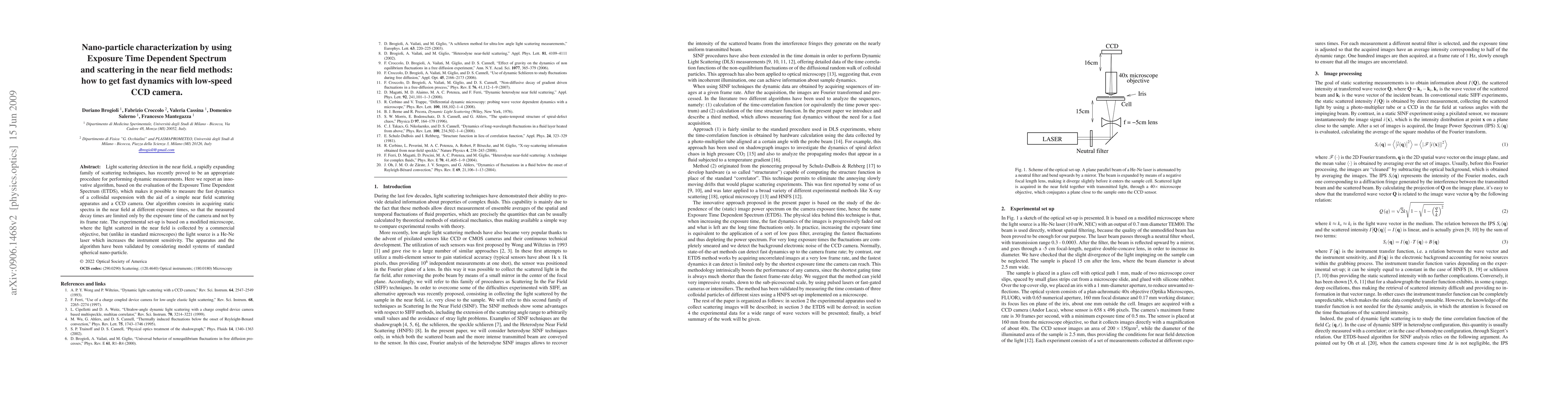 This paper presents an innovative algorithm for characterizing nano-particles using near field light scattering and an Exposure Time Dependent Spectrum (ETDS) to measure fast dynamics with a low-speed CCD camera. The method involves acquiring static spectra at varying exposure times, allowing decay times to be limited by exposure time rather than frame rate, validated by model systems of spherical nano-particles.