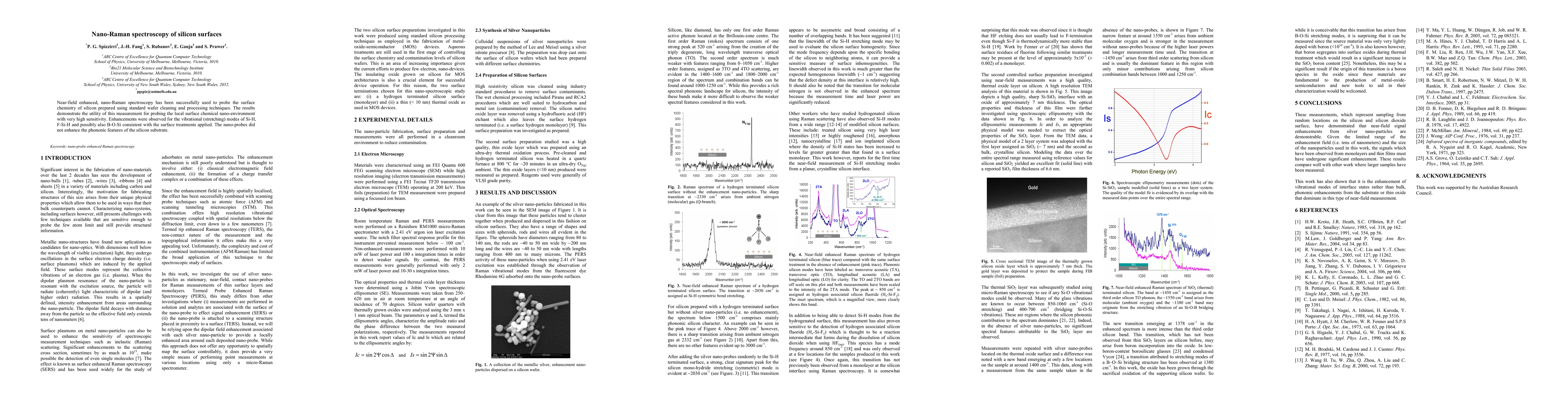 This paper demonstrates the use of near-field enhanced nano-Raman spectroscopy to probe the surface chemistry of silicon wafers, revealing high sensitivity in detecting Si-H, F-Si-H, and possibly B-O-Si vibrational modes, while not enhancing phononic features of the silicon substrate.