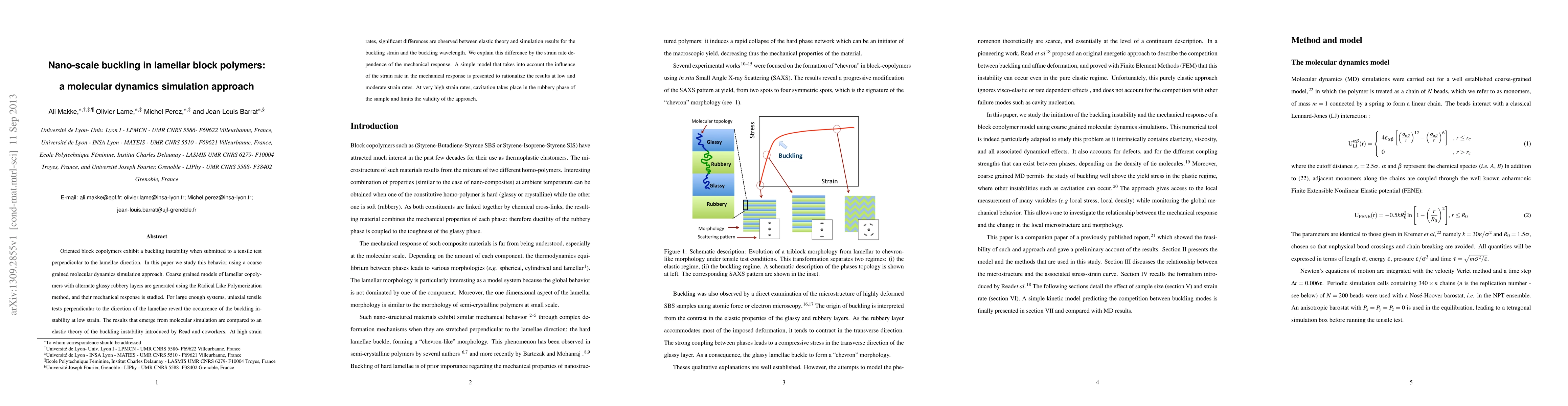 This paper uses coarse-grained molecular dynamics simulations to study the buckling instability in oriented lamellar block copolymers under tensile stress. The simulations reveal differences between predicted buckling behavior and elastic theory, particularly at high strain rates, due to the strain rate dependence and cavitation in the rubbery phase.