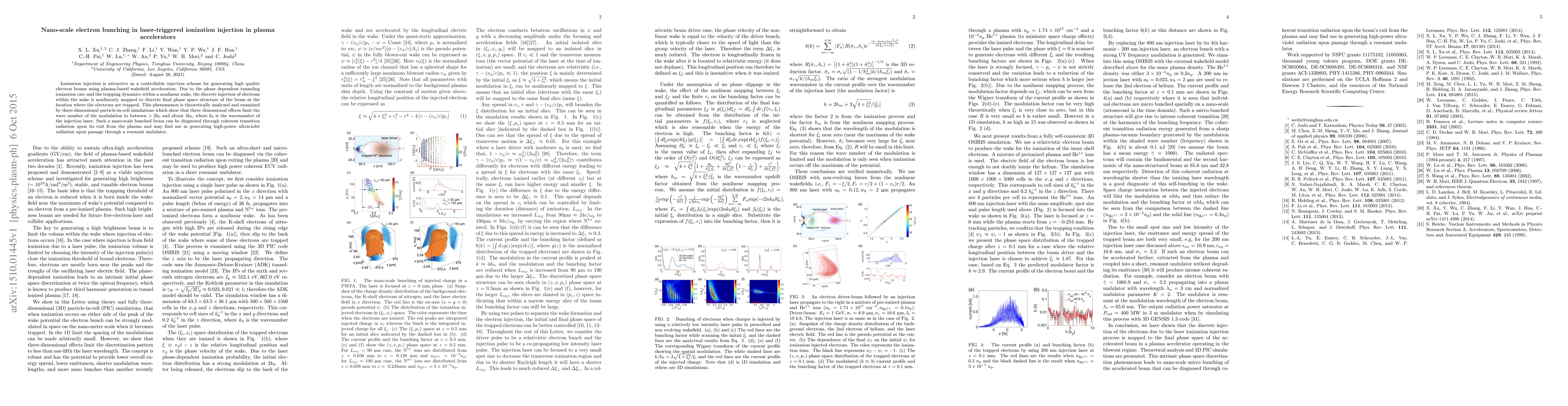 This paper investigates ionization injection in plasma accelerators, demonstrating that phase-dependent tunneling ionization and nonlinear wake trapping create nano-scale electron bunching. Simulations reveal that three-dimensional effects constrain the modulation wave number, potentially enabling high-power ultraviolet radiation generation.