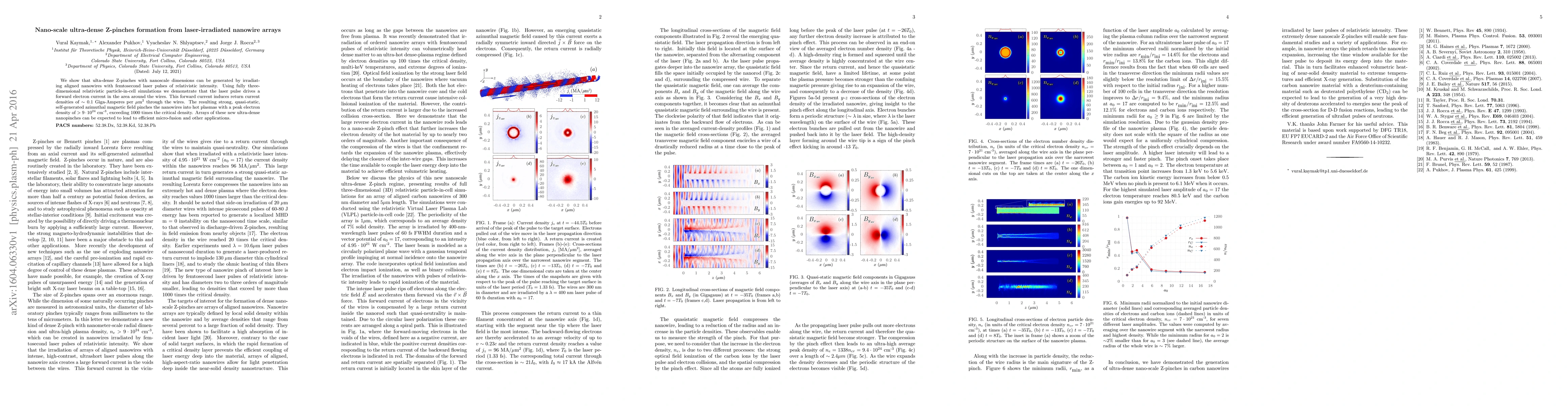 This paper demonstrates the creation of ultra-dense Z-pinches with nanoscale dimensions by irradiating aligned nanowire arrays with femtosecond laser pulses. The laser-driven forward electron current generates a strong azimuthal magnetic field, resulting in plasmas with electron densities exceeding 1000 times the critical density, potentially enabling efficient micro-fusion and other advanced applications.