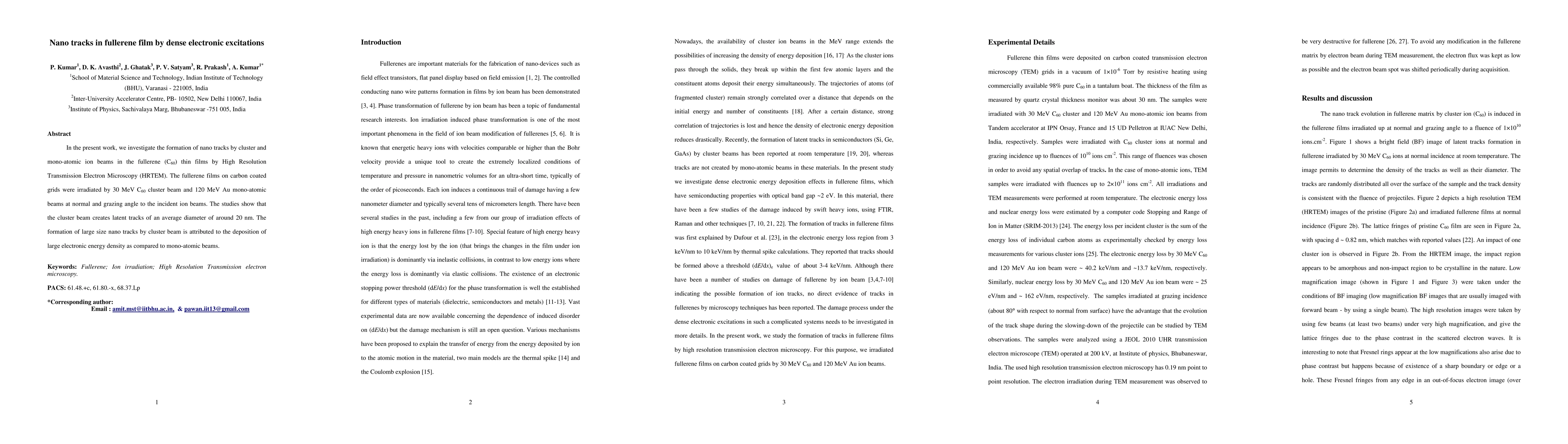This study investigates nano track formation in fullerene (C60) films via HRTEM after irradiation by 30 MeV C60 cluster and 120 MeV Au mono-atomic beams. Cluster beams produce latent tracks of about 20 nm diameter, attributed to higher electronic energy density deposition.