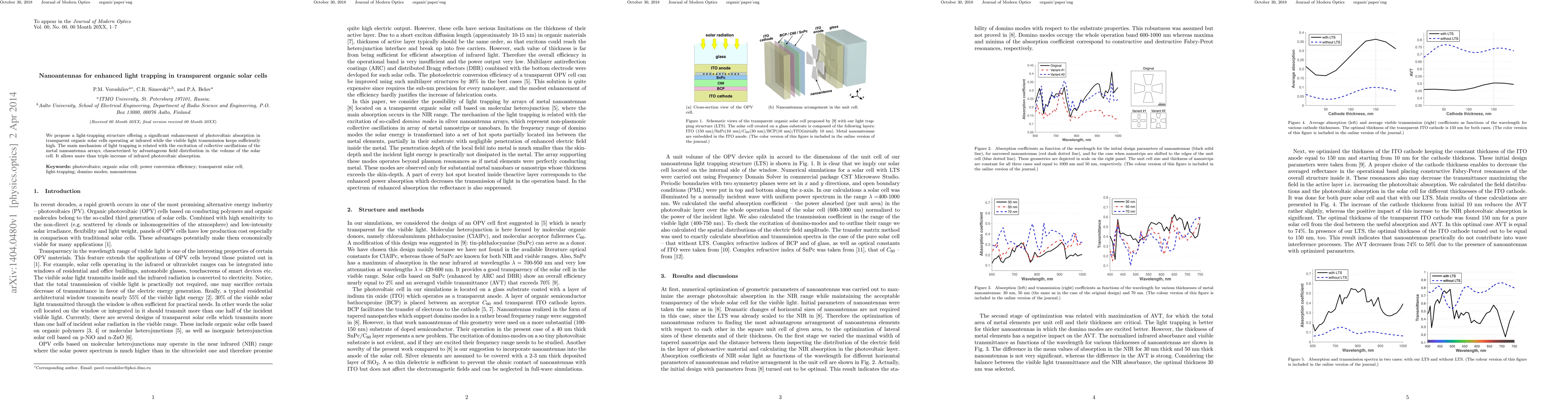 The paper presents a novel light-trapping structure based on metal nanoantennas supporting domino modes, which significantly enhances photovoltaic absorption in thin organic solar cells.
