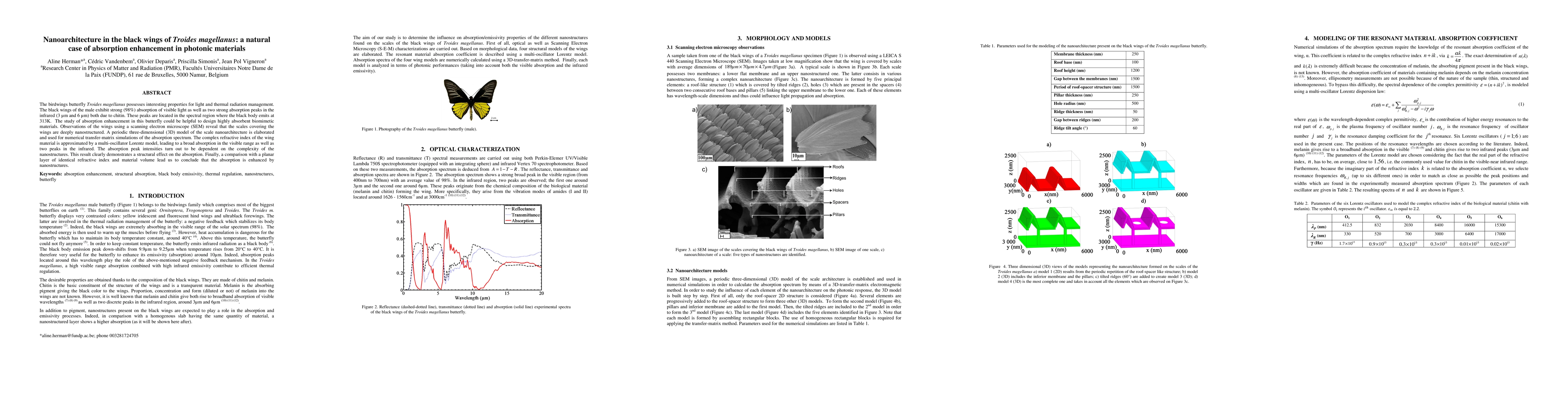 The birdwings butterfly Troides magellanus possesses interesting properties for light and thermal radiation management. The black wings of the male exhibit strong (98%) absorption of visible light as well as two strong absorption peaks in the infrared both due to chitin. These peaks are located in the spectral region where the black body emits at 313K. The study of absorption enhancement in this butterfly could be helpful to design highly absorbent biomimetic materials. Observations of the wings using a scanning electron microscope (SEM) reveal that the scales covering the wings are deeply nanostructured. A periodic three-dimensional (3D) model of the scale nanoarchitecture is elaborated and used for numerical transfer-matrix simulations of the absorption spectrum. The complex refractive index of the wing material is approximated by a multi-oscillator Lorentz model, leading to a broad absorption in the visible range as well as two peaks in the infrared. The absorption peak intensities turn out to be dependent on the complexity of the nanostructures. This result clearly demonstrates a structural effect on the absorption. Finally, a comparison with a planar layer of identical refractive index and material volume lead us to conclude that the absorption is enhanced by nanostructures.