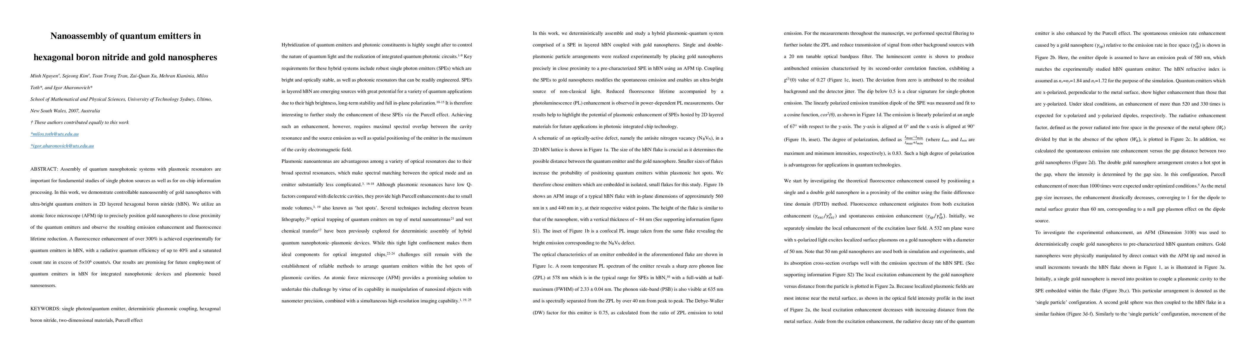 This paper demonstrates the precise nanoassembly of gold nanospheres with quantum emitters in hexagonal boron nitride using an AFM tip, achieving significant fluorescence enhancement and emission efficiency improvements. The results hold promise for advanced integrated nanophotonic devices and plasmonic nanosensors.