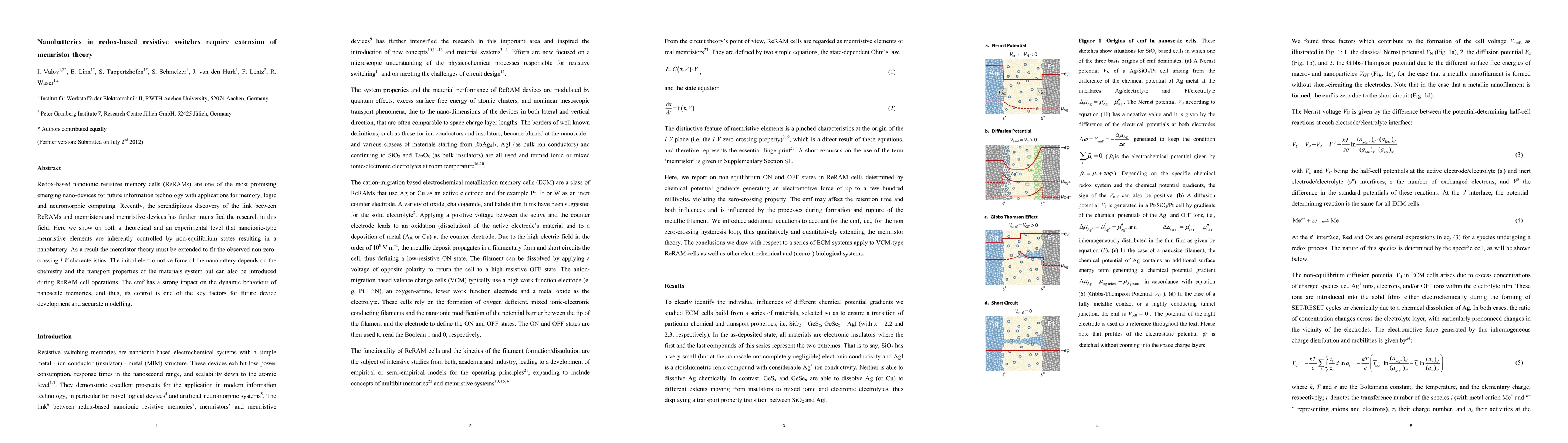 Redox-based nanoionic resistive memory cells (ReRAMs) are one of the most promising emerging nano-devices for future information technology with applications for memory, logic and neuromorphic computing. Recently, the serendipitous discovery of the link between ReRAMs and memristors and memristive devices has further intensified the research in this field. Here we show on both a theoretical and an experimental level that nanoionic-type memristive elements are inherently controlled by non-equilibrium states resulting in a nanobattery. As a result the memristor theory must be extended to fit the observed non zerocrossing I-V characteristics. The initial electromotive force of the nanobattery depends on the chemistry and the transport properties of the materials system but can also be introduced during ReRAM cell operations. The emf has a strong impact on the dynamic behaviour of nanoscale memories, and thus, its control is one of the key factors for future device development and accurate modelling.