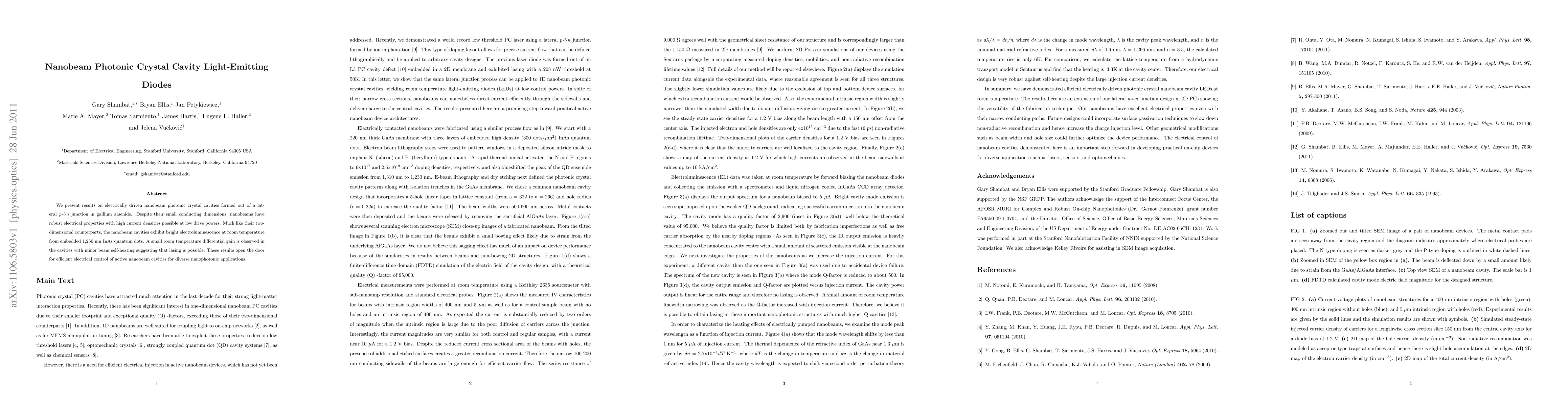 This paper reports on electrically driven nanobeam photonic crystal cavities in gallium arsenide, demonstrating robust electrical properties and bright electroluminescence from InAs quantum dots, indicating potential for efficient lasing and diverse nanophotonic applications.