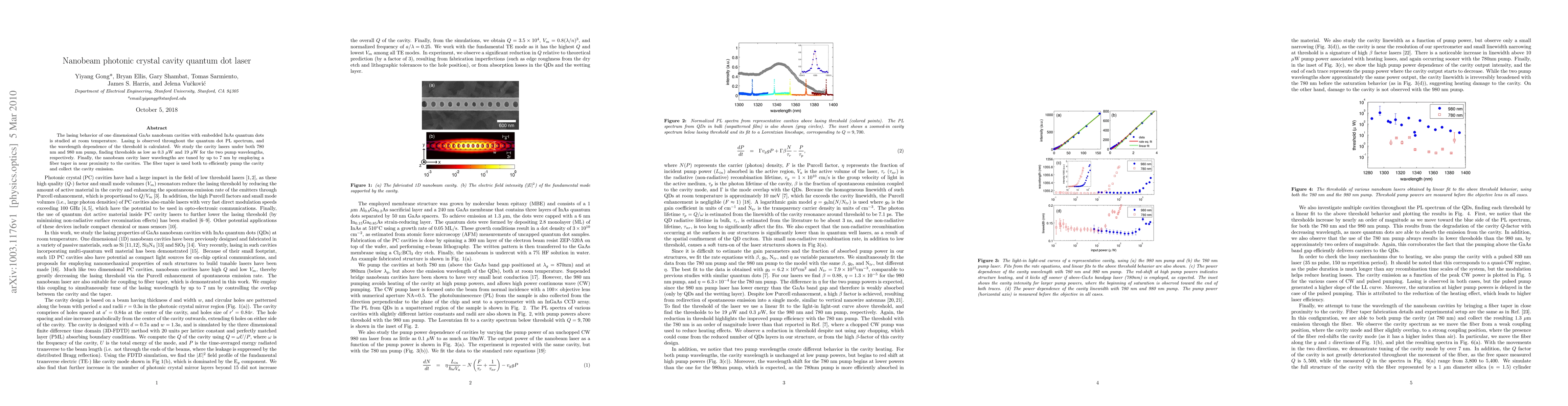 This paper investigates the lasing behavior of GaAs nanobeam photonic crystal cavities with embedded InAs quantum dots, achieving low threshold pump powers of 0.3 uW and 19 uW at 780 nm and 980 nm respectively. The laser wavelengths are tunable by up to 7 nm using a nearby fiber taper for efficient pumping and emission collection.