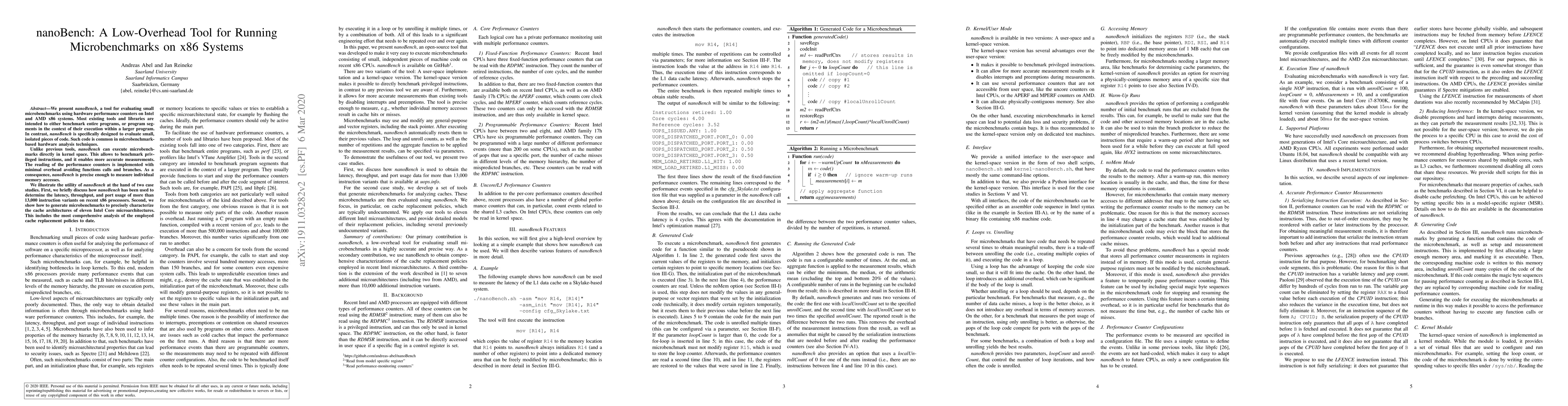 nanoBench is a low-overhead tool for running microbenchmarks on x86 systems, designed to evaluate small, isolated code snippets using hardware performance counters. It executes microbenchmarks directly in kernel space for precise measurements of privileged instructions and individual memory accesses.
