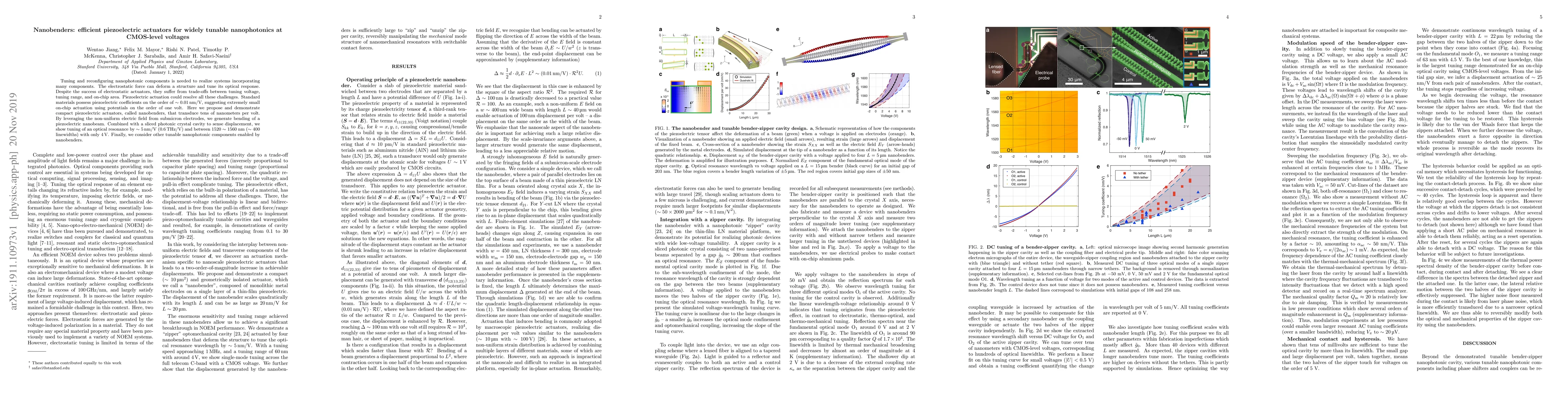 This paper proposes and demonstrates nanobenders, compact piezoelectric actuators capable of achieving tens of nanometers per volt bending, enabling widely tunable nanophotonic components at CMOS-level voltages. The nanobenders achieve a tuning range of approximately 400 linewidths with a mere 4V, overcoming limitations of electrostatic actuators.