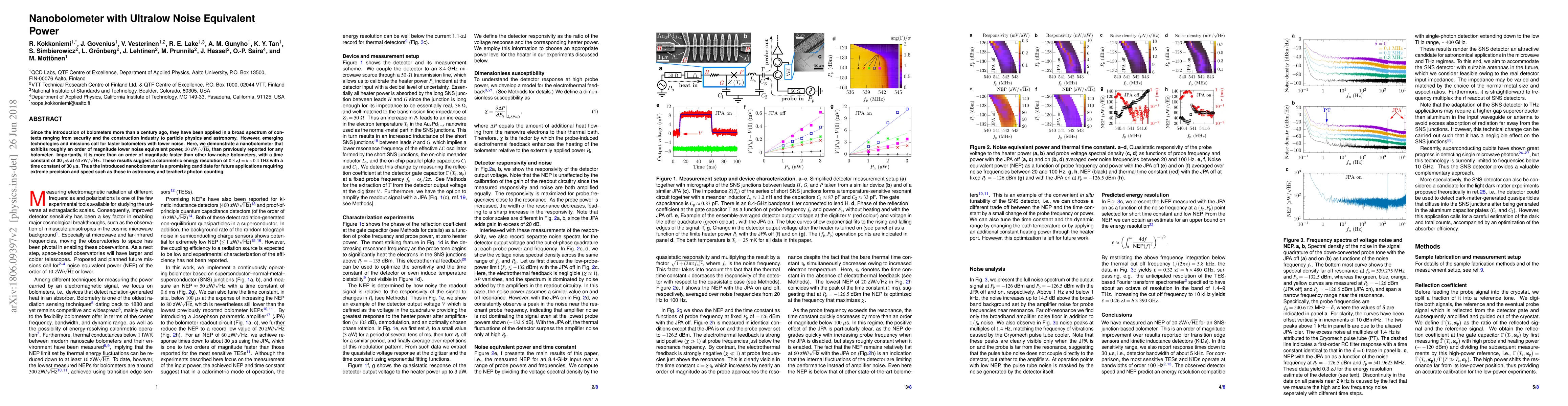 This paper introduces a nanobolometer with ultralow noise equivalent power of $20\textrm{ zW}/\sqrt{\textrm{Hz}}$, significantly outperforming previous models. It also boasts a time constant of 30 $\mu$s, making it more than an order of magnitude faster, thus promising for high-precision applications in astronomy and terahertz photon counting.