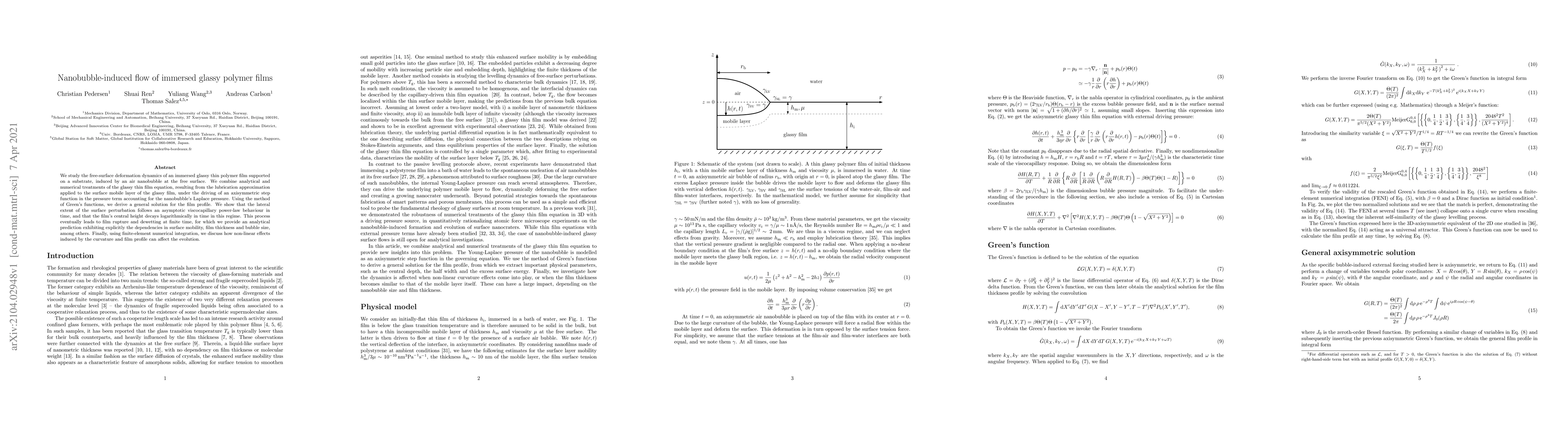 We study the free-surface deformation dynamics of an immersed glassy thin polymer film supported on a substrate, induced by an air nanobubble at the free surface.We combine analytical and numerical treatments of the glassy thin film equation, resulting from the lubrication approximation applied to the surface mobile layer of the glassy film, under the driving of an axisymmetric step function in the pressure term accounting for the nanobubble's Laplace pressure. Using the method of Green's functions, we derive a general solution for the film profile. We show that the lateral extent of the surface perturbation follows an asymptotic viscocapillary power-law behaviour in time, and that the film's central height decays logarithmically in time in this regime. This process eventually leads to film rupture and dewetting at finite time, for which we provide an analytical prediction exhibiting explicitly the dependencies in surface mobility, film thickness and bubble size, among others. Finally, using finite-element numerical integration, we discuss how non-linear effects induced by the curvature and film profile can affect the evolution.
