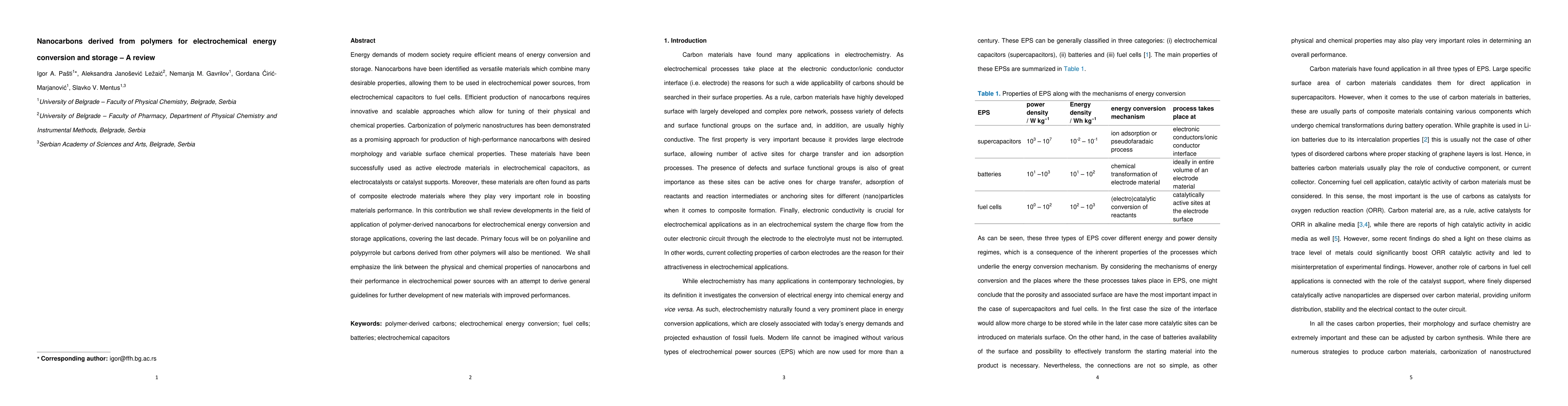 This paper reviews the progress in using polymer-derived nanocarbons for electrochemical energy conversion and storage, focusing on polyaniline and polypyrrole, while also mentioning other polymers. The study highlights the relationship between the physical and chemical properties of these nanocarbons and their performance in electrochemical applications, aiming to guide future material development.