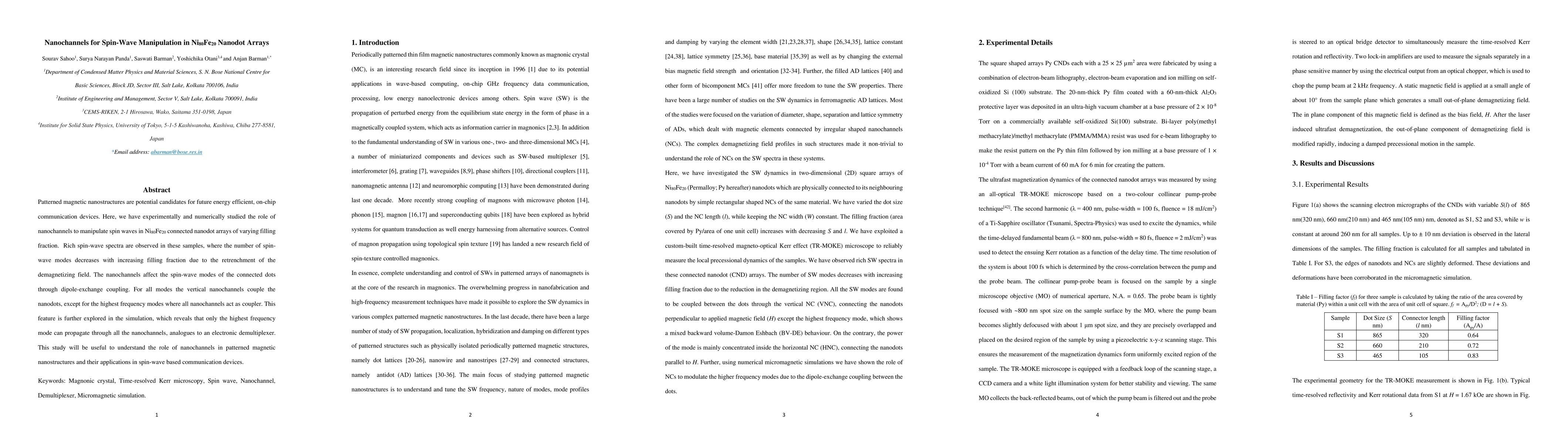 This study explores the use of nanochannels in Ni80Fe20 nanodot arrays to manipulate spin waves, revealing that nanochannels influence spin-wave modes via dipole-exchange coupling, with the highest frequency mode propagating through all channels akin to a demultiplexer. The findings provide insights into the potential of patterned magnetic nanostructures for energy-efficient, on-chip communication.