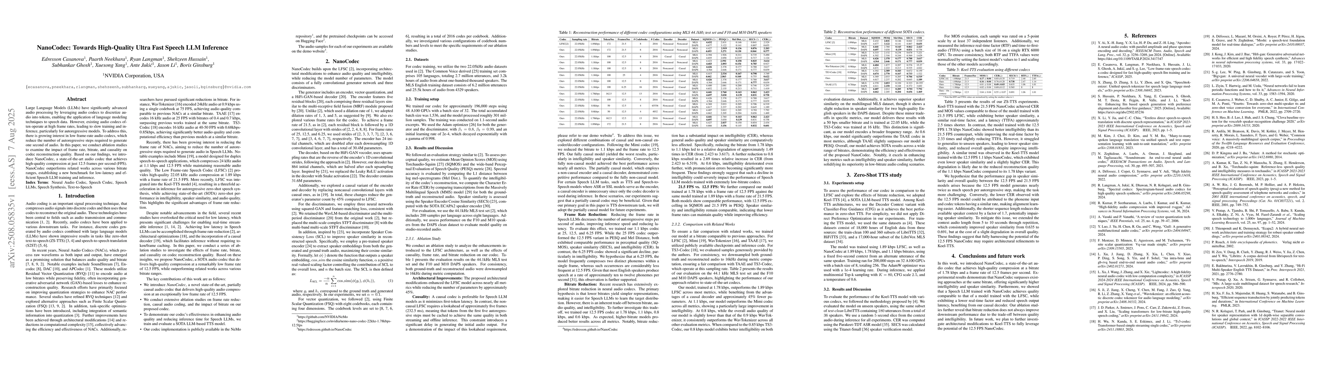 The paper introduces NanoCodec, an audio codec designed for high-quality, ultra-fast speech LLM inference. It conducts ablation studies to examine the impact of frame rate, bitrate, and causality on codec reconstruction quality, building upon the LFSC architecture and incorporating architectural modifications to enhance audio quality and intelligibility while reducing model parameters.