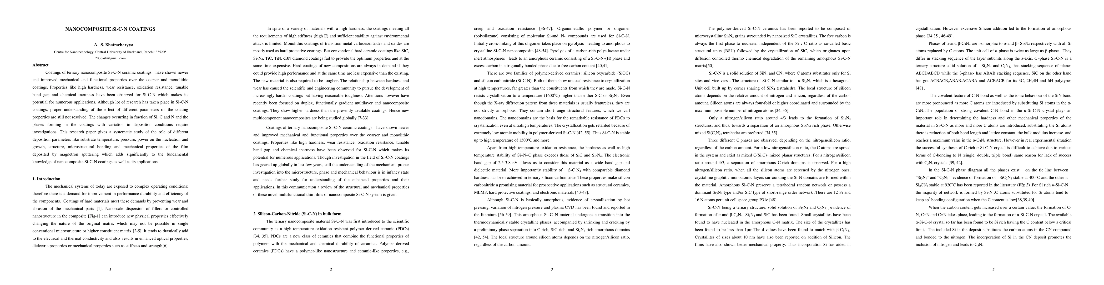 This paper investigates the effects of deposition parameters on the properties of nanocomposite Si-C-N coatings deposited via magnetron sputtering, revealing significant influences on nucleation, growth, structure, and mechanical properties, thus enhancing fundamental understanding and potential applications.