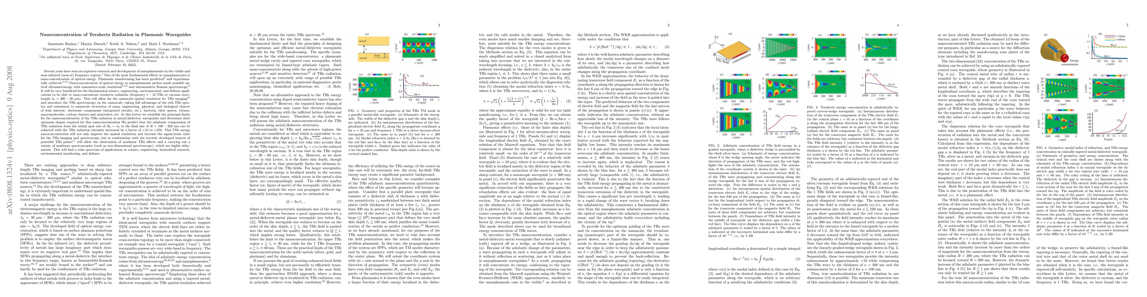 Recent years have seen an explosive research and development of nanoplasmonics in the visible and near-infrared (near-ir) frequency regions. One of the most fundamental effects in nanoplasmonics is nano-concentration of optical energy. Plasmonic nanofocusing has been predicted and experimentally achieved. It will be very beneficial for the fundamental science, engineering, environmental, and defense applications to be able to nano-concentrate terahertz radiation (frequency 1 - 10 THz or vacuum wavelength 300 - 30 microns). This will allow for the nanoscale spatial resolution for THz imaging and introduce the THz spectroscopy on the nanoscale, taking full advantage of the rich THz spectra and submicron to nanoscale structures of many engineering, physical, and biological objects of wide interest: electronic components (integrated circuits, etc.), bacteria, their spores, viruses, macromolecules, carbon clusters and nanotubes, etc. In this Letter we establish the principal limits for the nanoconcentration of the THz radiation in metal/dielectric waveguides and determine their optimum shapes required for this nanoconcentration We predict that the adiabatic compression of THz radiation from the initial spot size of light wavelength to the final size of R = 100 - 250 nm can be achieved with the THz radiation intensity increased by a factor of 10 to 250. This THz energy nanoconcentration will not only improve the spatial resolution and increase the signal/noise ratio for the THz imaging and spectroscopy, but in combination with the recently developed sources of powerful THz pulses will allow the observation of nonlinear THz effects and a carrying out a variety of nonlinear spectroscopies (such as two-dimensional spectroscopy), which are highly informative.
