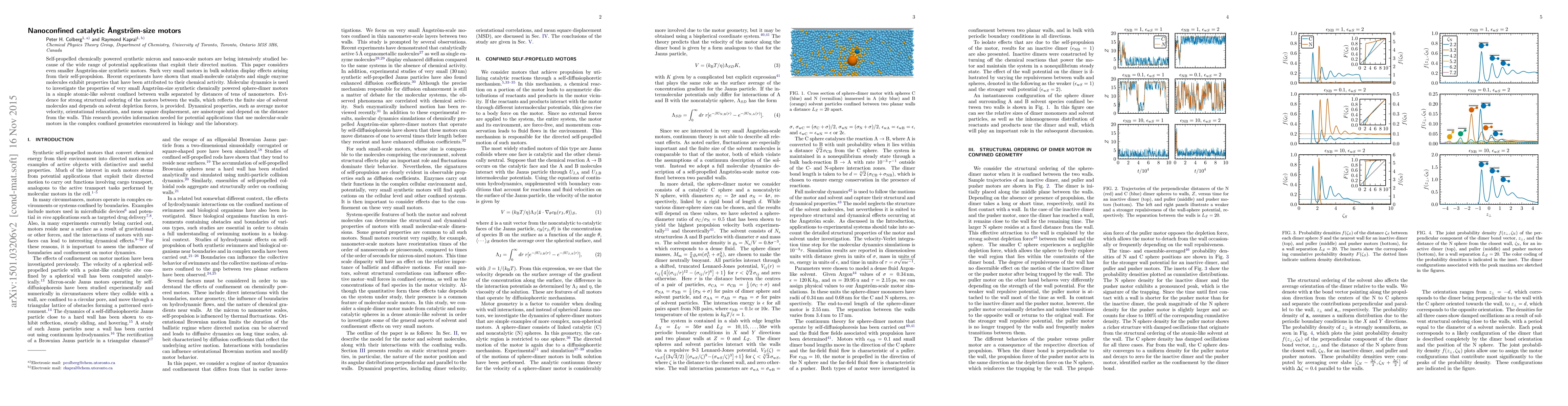 Self-propelled chemically powered synthetic micron and nano-scale motors are being intensively studied because of the wide range of potential applications that exploit their directed motion. This paper considers even smaller {\AA}ngstr\"om-size synthetic motors. Such very small motors in bulk solution display effects arising from their self-propulsion. Recent experiments have shown that small-molecule catalysts and single enzyme molecules exhibit properties that have been attributed to their chemical activity. Molecular dynamics is used to investigate the properties of very small {\AA}ngstr\"om-size synthetic chemically powered sphere-dimer motors in a simple atomic-like solvent confined between walls separated by distances of tens of nanometers. Evidence for strong structural ordering of the motors between the walls, which reflects the finite size of solvent molecules and depends on solvent depletion forces, is provided. Dynamical properties, such as average motor velocity, orientational relaxation, and mean square displacement, are anisotropic and depend on the distance from the walls. This research provides information needed for potential applications that use molecular-scale motors in the complex confined geometries encountered in biology and the laboratory.