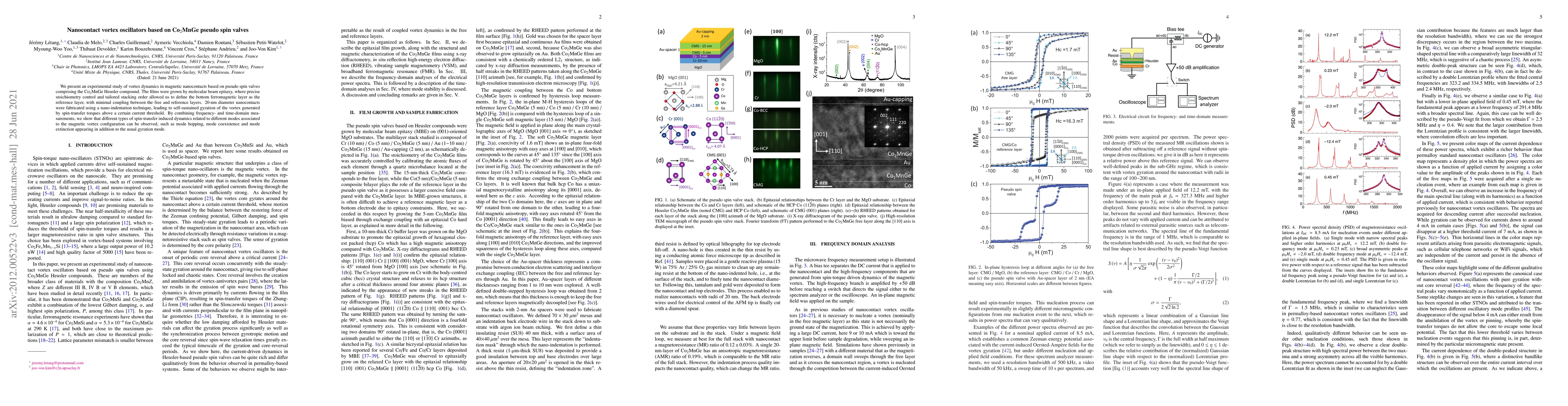 We present an experimental study of vortex dynamics in magnetic nanocontacts based on pseudo spin valves comprising the Co$_2$MnGe Heusler compound. The films were grown by molecular beam epitaxy, where precise stoichiometry control and tailored stacking order allowed us to define the bottom ferromagnetic layer as the reference layer, with minimal coupling between the free and reference layers. 20-nm diameter nanocontacts were fabricated using a nano-indentation technique, leading to self-sustained gyration of the vortex generated by spin-transfer torques above a certain current threshold. By combining frequency- and time-domain measurements, we show that different types of spin-transfer induced dynamics related to different modes associated to the magnetic vortex configuration can be observed, such as mode hopping, mode coexistence and mode extinction appear in addition to the usual gyration mode.
