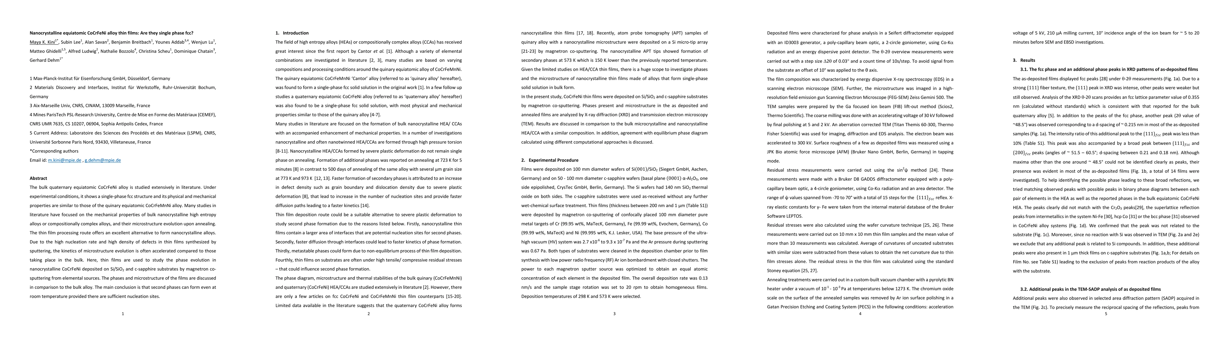 The bulk quaternary equiatomic CoCrFeNi alloy is studied extensively in literature. Under experimental conditions, it shows a single-phase fcc structure and its physical and mechanical properties are similar to those of the quinary equiatomic CoCrFeMnNi alloy. Many studies in literature have focused on the mechanical properties of bulk nanocrystalline high entropy alloys or compositionally complex alloys, and their microstructure evolution upon annealing. The thin film processing route offers an excellent alternative to form nanocrystalline alloys. Due to the high nucleation rate and high density of defects in thin films synthesized by sputtering, the kinetics of microstructure evolution is often accelerated compared to those taking place in the bulk. Here, thin films are used to study the phase evolution in nanocrystalline CoCrFeNi deposited on Si/SiO 2 and c-sapphire substrates by magnetron cosputtering from elemental sources. The phases and microstructure of the films are discussed in comparison to the bulk alloy. The main conclusion is that second phases can form even at room temperature provided there are sufficient nucleation sites.