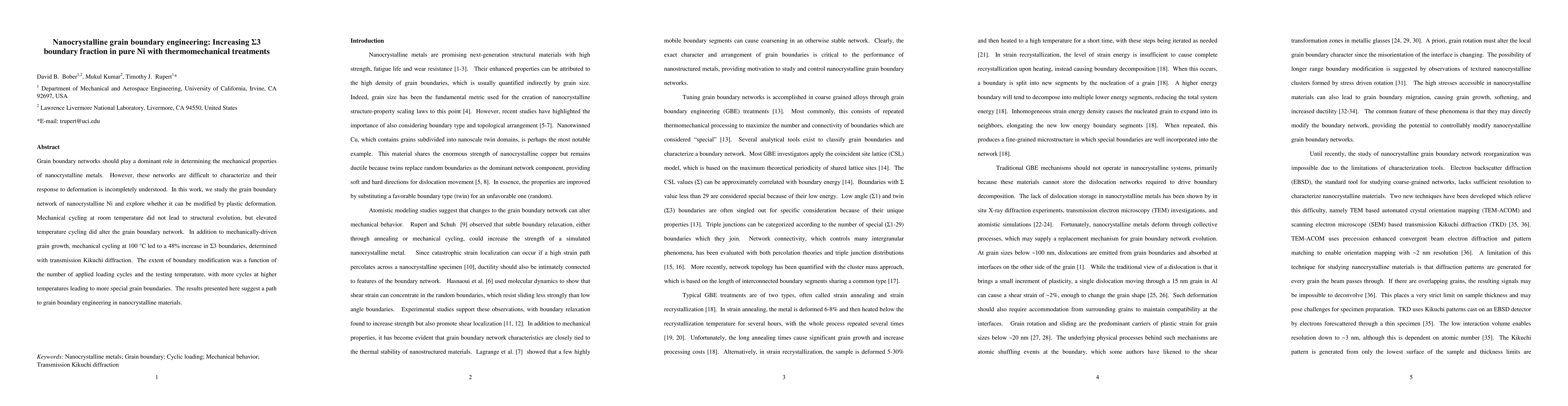 This study investigates how thermomechanical treatments affect the grain boundary network in nanocrystalline nickel, finding that elevated temperature mechanical cycling increases the fraction of $\Sigma$3 grain boundaries by 48%. The results suggest a method for grain boundary engineering in nanocrystalline materials through controlled mechanical cycling.