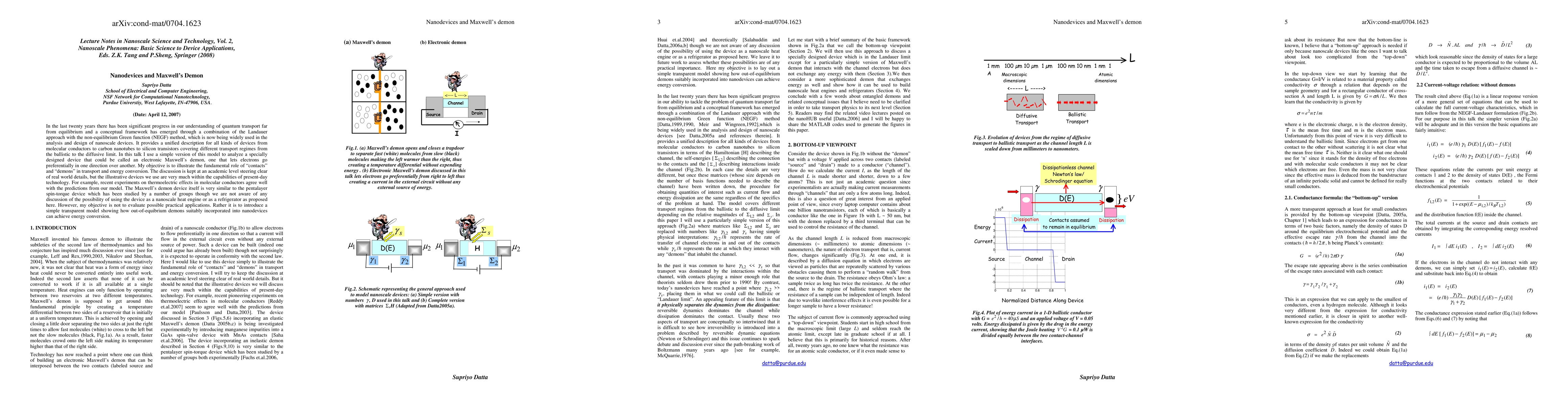 In the last twenty years there has been significant progress in our understanding of quantum transport far from equilibrium and a conceptual framework has emerged through a combination of the Landauer approach with the non-equilibrium Green function (NEGF) method, which is now being widely used in the analysis and design of nanoscale devices. It provides a unified description for all kinds of devices from molecular conductors to carbon nanotubes to silicon transistors covering different transport regimes from the ballistic to the diffusive limit. In this talk I use a simple version of this model to analyze a specially designed device that could be called an electronic Maxwell's demon, one that lets electrons go preferentially in one direction over another. My objective is to illustrate the fundamental role of contacts and demons in transport and energy conversion. The discussion is kept at an academic level steering clear of real world details, but the illustrative devices we use are very much within the capabilities of present-day technology. For example, recent experiments on thermoelectric effects in molecular conductors agree well with the predictions from our model. The Maxwell's demon device itself is very similar to the pentalayer spin-torque device which has been studied by a number of groups though we are not aware of any discussion of the possibility of using the device as a nanoscale heat engine or as a refrigerator as proposed here. However, my objective is not to evaluate possible practical applications. Rather it is to introduce a simple transparent model showing how out-of-equibrium demons suitably incorporated into nanodevices can achieve energy conversion.