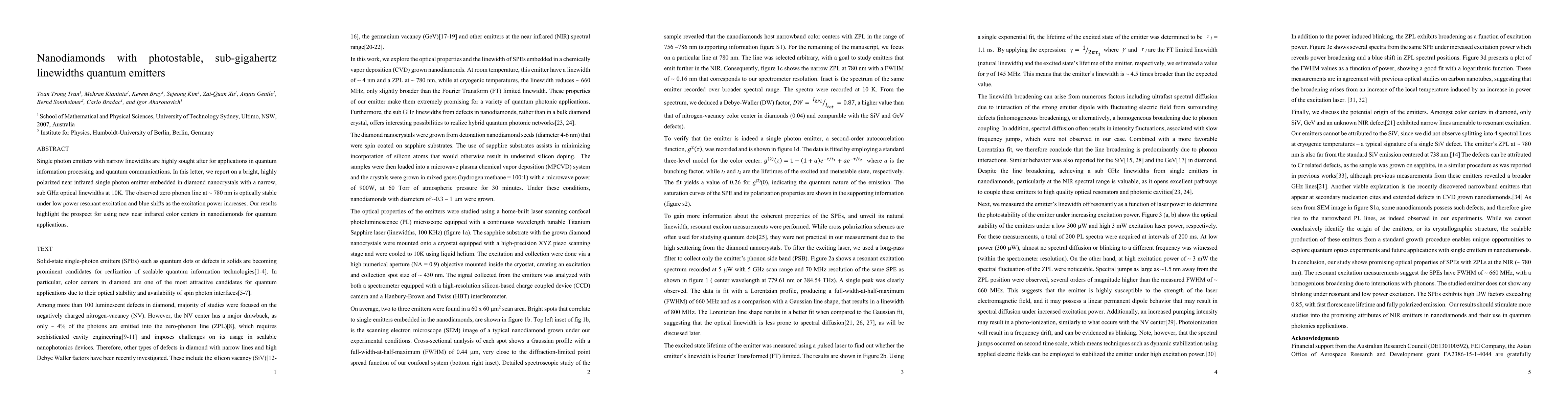 This paper presents a bright, highly polarized single photon emitter in diamond nanocrystals with narrow, sub-gigahertz optical linewidths, suitable for quantum information and communication applications, demonstrating optical stability under low power excitation. The findings suggest potential use of these near-infrared color centers in nanodiamonds for quantum technologies.