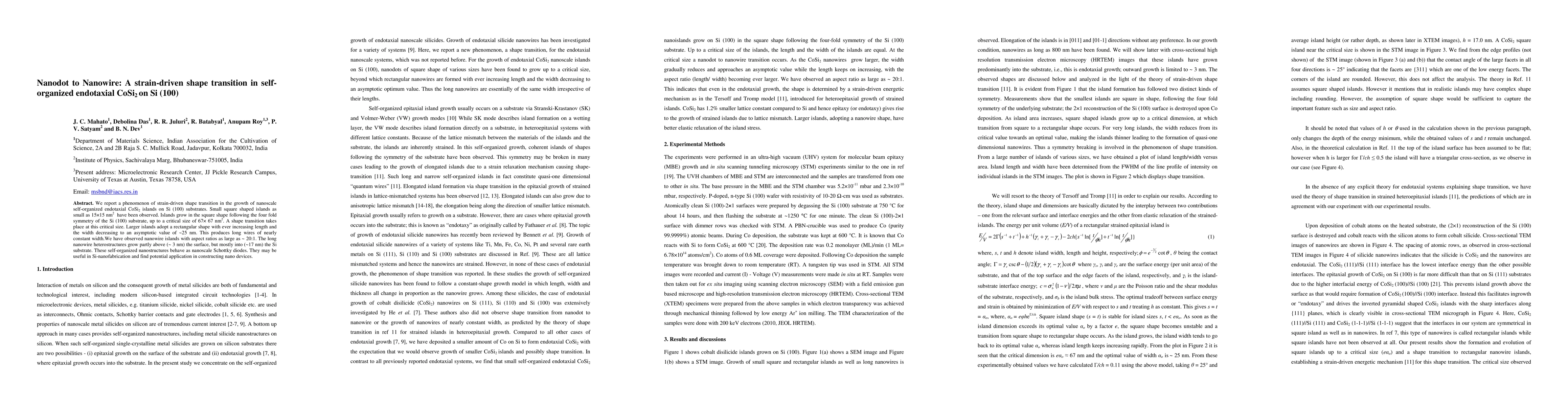 We report a phenomenon of strain-driven shape transition in the growth of nanoscale self-organized endotaxial CoSi2 islands on Si (100) substrates. Small square shaped islands as small as 15\times15 nm2 have been observed. Islands grow in the square shape following the four fold symmetry of the Si (100) substrate, up to a critical size of 67 \times 67 nm2. A shape transition takes place at this critical size. Larger islands adopt a rectangular shape with ever increasing length and the width decreasing to an asymptotic value of ~25 nm. This produces long wires of nearly constant width.We have observed nanowire islands with aspect ratios as large as ~ 20:1. The long nanowire heterostructures grow partly above (~ 3 nm) the surface, but mostly into (~17 nm) the Si substrate. These self-organized nanostructures behave as nanoscale Schottky diodes. They may be useful in Si-nanofabrication and find potential application in constructing nano devices.