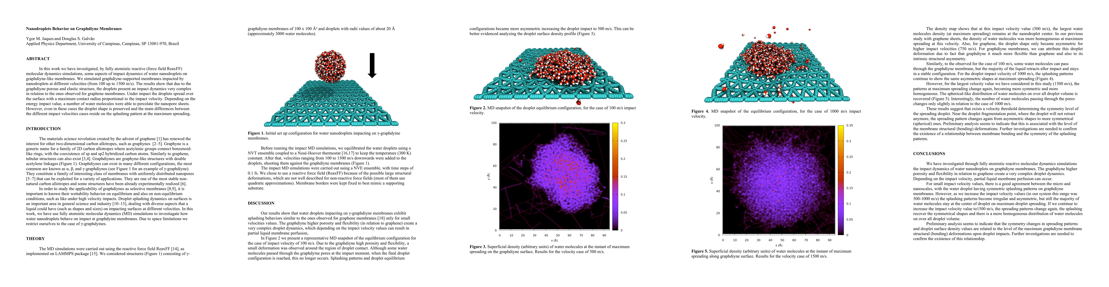 This study uses atomistic molecular dynamics simulations to analyze the complex impact dynamics of water nanodroplets on graphdiyne membranes at varying velocities. The porous and elastic nature of the graphdiyne structure results in unique droplet spreading and splashing patterns compared to graphene membranes, with droplet shape preservation despite varying impact energies.