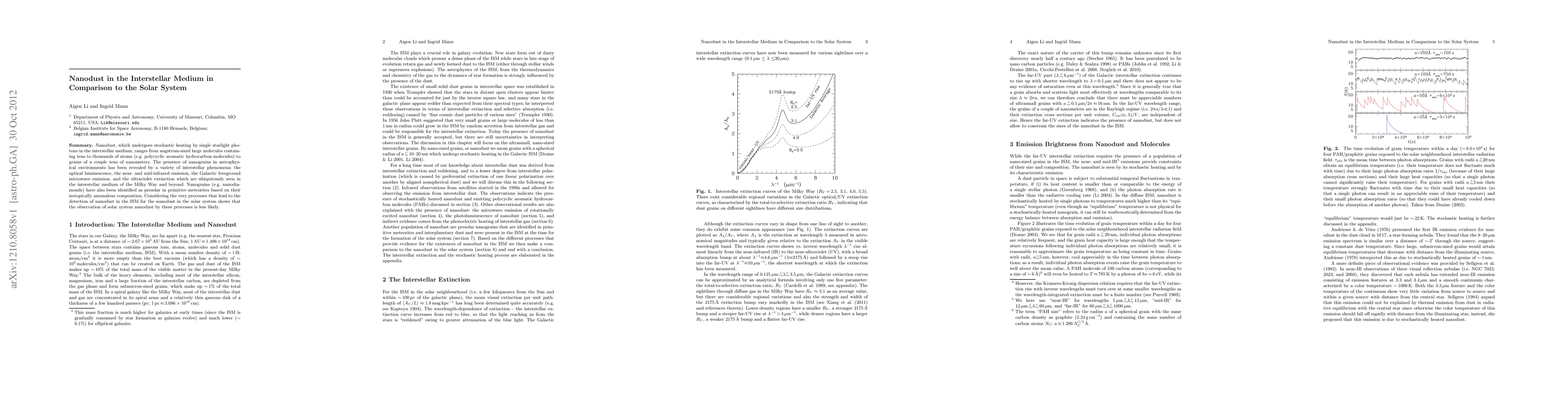This paper investigates nanodust in the interstellar medium (ISM) and compares it to nanodust in the solar system. It finds that nanodust in the ISM, ranging from angstrom-sized molecules to nanometer grains, is detectable through various phenomena, while solar system nanodust is less likely to be observed using similar methods.