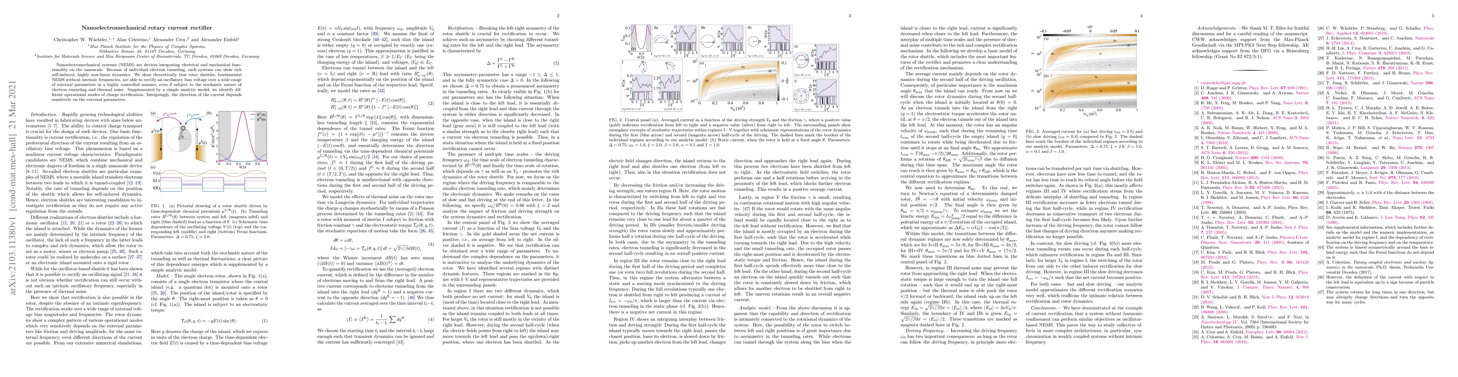 This paper explores the theoretical potential of nanoelectromechanical systems (NEMS) to rectify an oscillatory bias voltage through rotor shuttles, demonstrating controlled charge rectification despite electron tunneling and thermal noise. The study identifies various operational modes and highlights the sensitivity of current direction to external parameters.