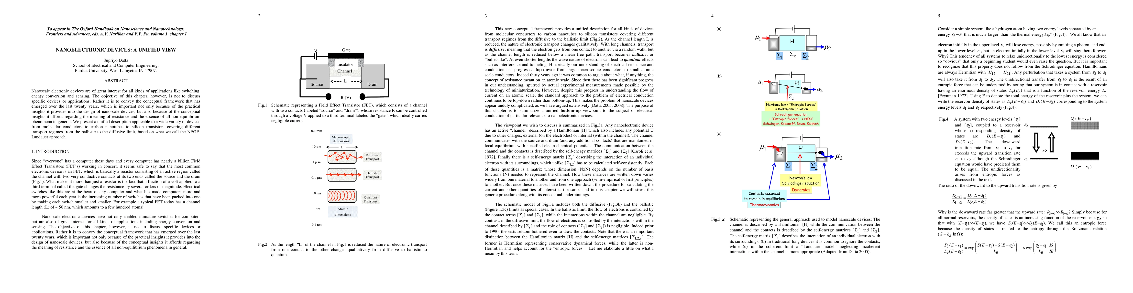 Nanoscale electronic devices are of great interest for all kinds of applications like switching, energy conversion and sensing. The objective of this chapter, however, is not to discuss specific devices or applications. Rather it is to convey the conceptual framework that has emerged over the last twenty years, which is important not only because of the practical insights it provides into the design of nanoscale devices, but also because of the conceptual insights it affords regarding the meaning of resistance and the essence of all non-equilibrium phenomena in general. We present a unified description applicable to a wide variety of devices from molecular conductors to carbon nanotubes to silicon transistors covering different transport regimes from the ballistic to the diffusive limit, based on what we call the NEGF-Landauer approach.