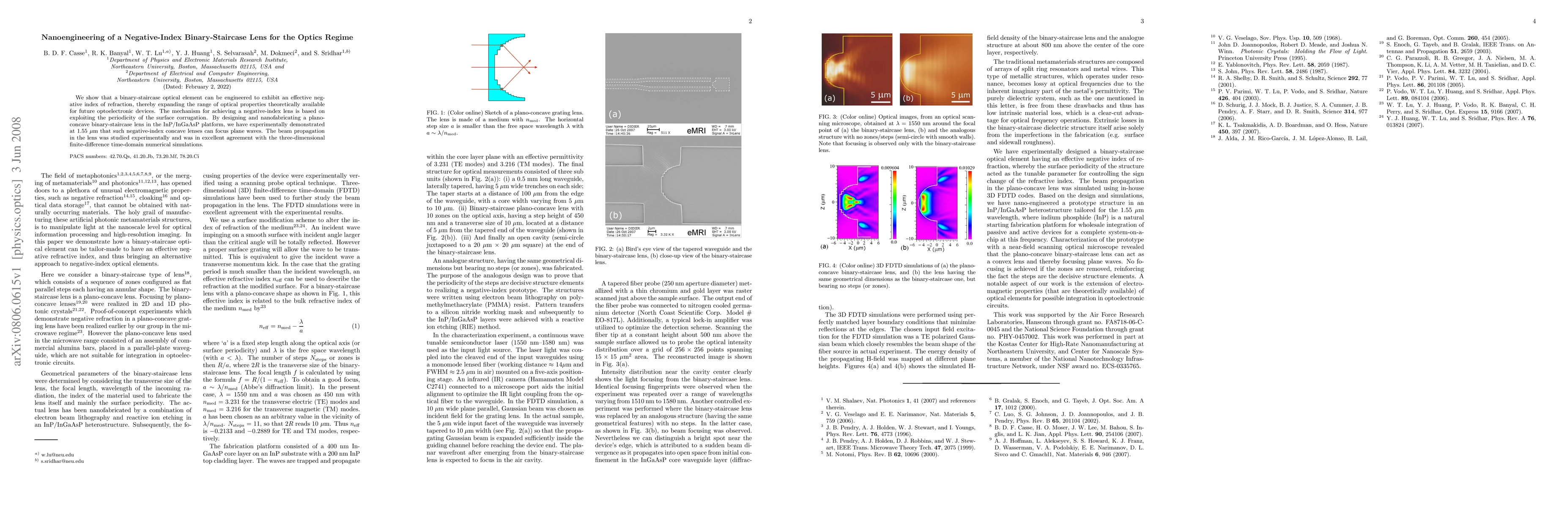 We show that a binary-staircase optical element can be engineered to exhibit an effective negative index of refraction, thereby expanding the range of optical properties theoretically available for future optoelectronic devices. The mechanism for achieving a negative-index lens is based on exploiting the periodicity of the surface corrugation. By designing and nanofabricating a plano-concave binary-staircase lens in the InP/InGaAsP platform, we have experimentally demonstrated at 1.55 microns that such negative-index concave lenses can focus plane waves. The beam propagation in the lens was studied experimentally and was in excellent agreement with the three-dimensional finite-difference time-domain numerical simulations.