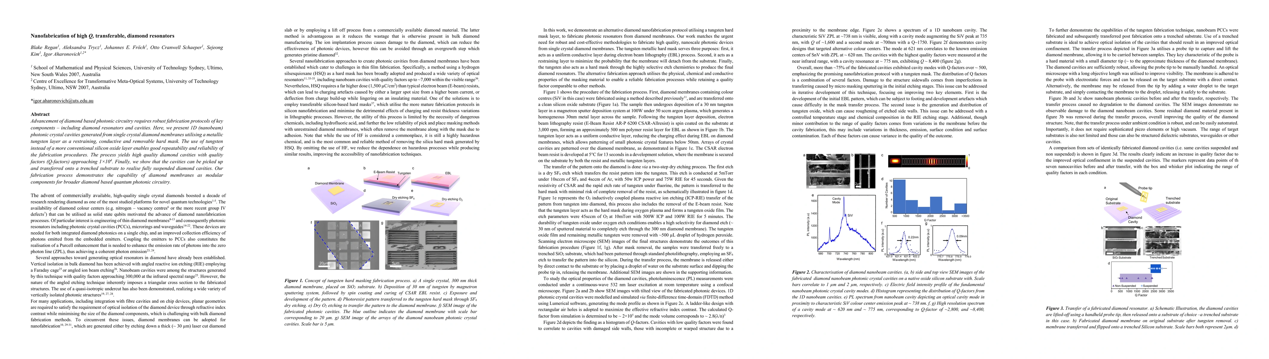 This paper presents a fabrication method for high Q diamond resonators using tungsten as a mask, achieving quality factors up to 10^4. The process allows for the transfer of these resonators onto different substrates, showcasing their potential as modular components in diamond-based photonic and quantum circuits.