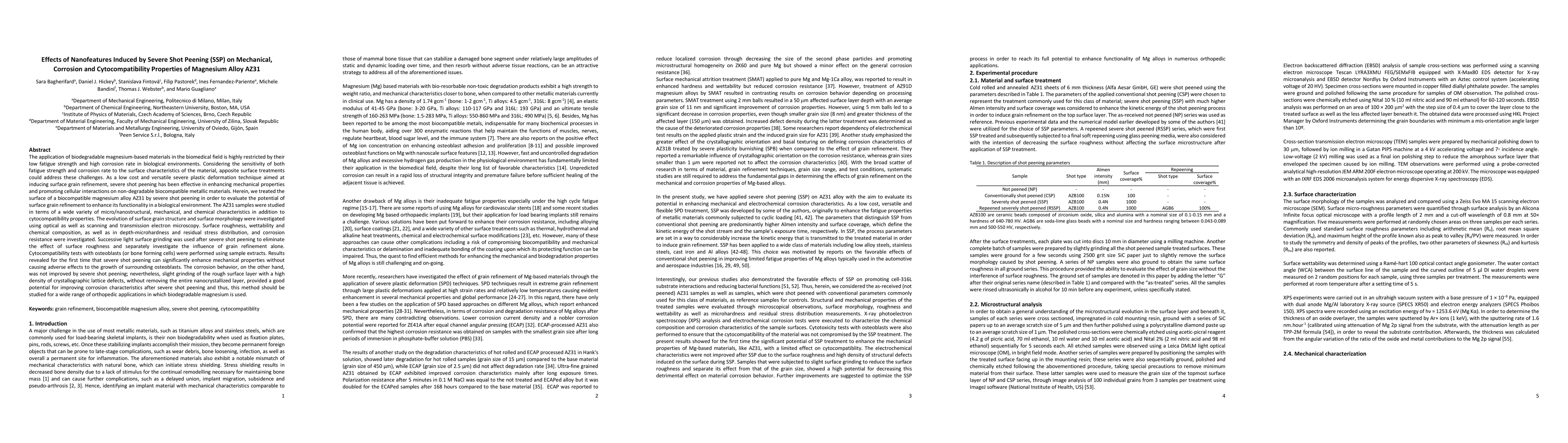 Considering the sensitivity of both fatigue strength and corrosion rate to the surface characteristics, apposite surface treatments could address the related challenges for biodegradable magnesium-based materials. Herein, we treated the surface of a biocompatible magnesium alloy by a low cost and versatile severe plastic deformation technique, severe shot peening, to evaluate the potential of surface grain refinement to enhance functionality in biological environment. The evolution of surface grain structure and surface morphology were investigated using optical as well as scanning and transmission electron microscopy. Surface roughness, wettability and chemical composition, as well as in depth-microhardness and residual stress distribution, and corrosion resistance were investigated. Successive light surface grinding was used after severe shot peening to eliminate the effect of surface roughness and separately investigate the influence of grain refinement alone. Cytocompatibility tests with osteoblasts (or bone forming cells) were performed using sample extracts. Results revealed for the first time that severe shot peening can significantly enhance mechanical properties without causing adverse effects to the growth of surrounding osteoblasts. The corrosion behavior, on the other hand, was not improved by severe shot peening; nevertheless, slight grinding of the rough surface layer with a high density of crystallographic lattice defects, without removing the entire nanocrystallized layer, provided a good potential for improving corrosion characteristics after severe shot peening and thus, this method should be studied for a wide range of orthopedic applications in which biodegradable magnesium is used.