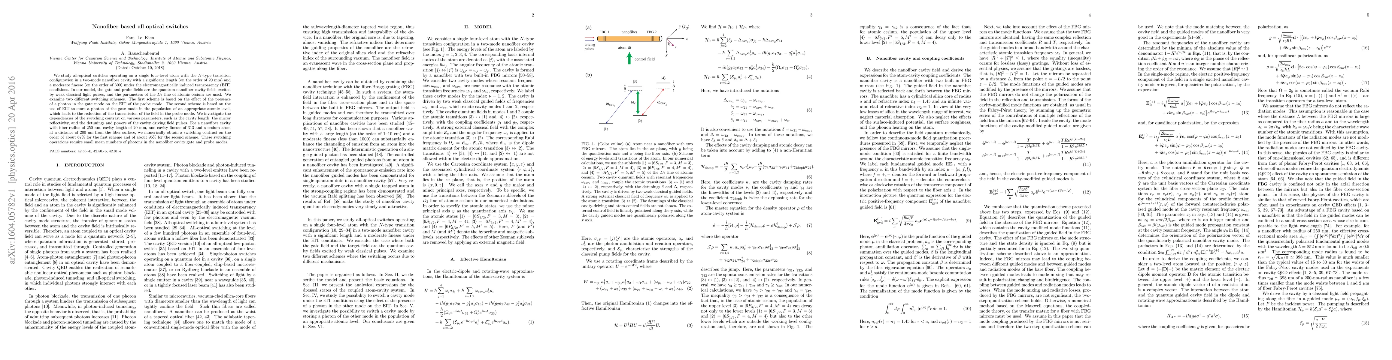We study all-optical switches operating on a single four-level atom with the $N$-type transition configuration in a two-mode nanofiber cavity with a significant length (on the order of $20$ mm) and a moderate finesse (on the order of 300) under the electromagnetically induced transparency (EIT) conditions. In our model, the gate and probe fields are the quantum nanofiber-cavity fields excited by weak classical light pulses, and the parameters of the $D_2$ line of atomic cesium are used. We examine two different switching schemes. The first scheme is based on the effect of the presence of a photon in the gate mode on the EIT of the probe mode. The second scheme is based on the use of EIT to store a photon of the gate mode in the population of an appropriate atomic level, which leads to the reduction of the transmission of the field in the probe mode. We investigate the dependencies of the switching contrast on various parameters, such as the cavity length, the mirror reflectivity, and the detunings and powers of the cavity driving field pulses. For a nanofiber cavity with fiber radius of 250 nm, cavity length of 20 mm, and cavity finesse of 313 and a cesium atom at a distance of 200 nm from the fiber surface, we numerically obtain a switching contrast on the order of about 67% for the first scheme and of about 95% for the second scheme. These switching operations require small mean numbers of photons in the nanofiber cavity gate and probe modes.