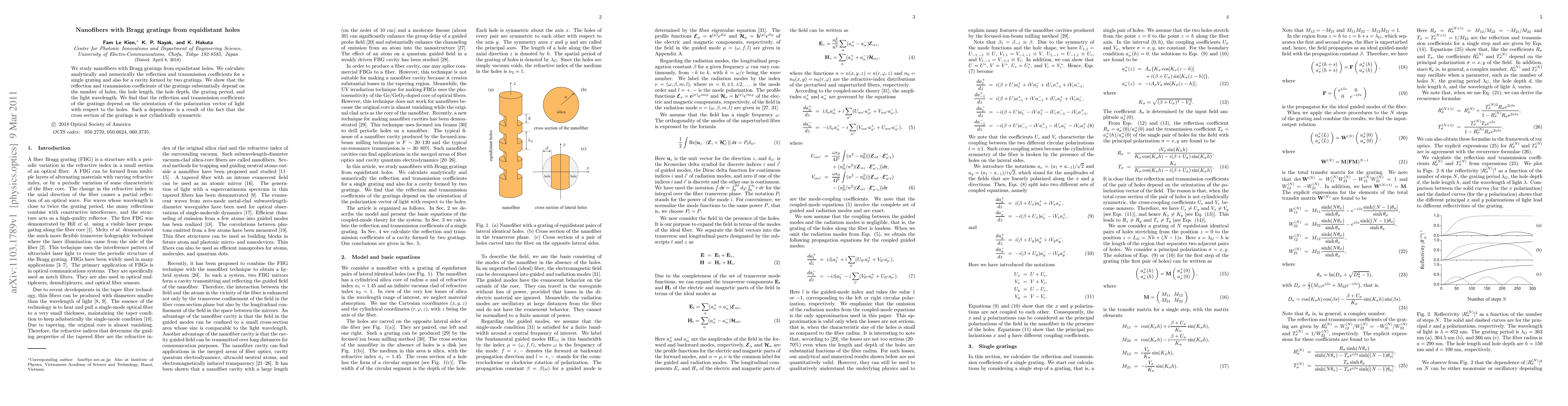 This research investigates nanofibers with Bragg gratings formed by equidistant holes, analyzing both analytically and numerically the reflection and transmission coefficients. It concludes that these coefficients are significantly influenced by factors including hole parameters and light polarization, due to the non-cylindrical symmetry of the gratings' cross section.
