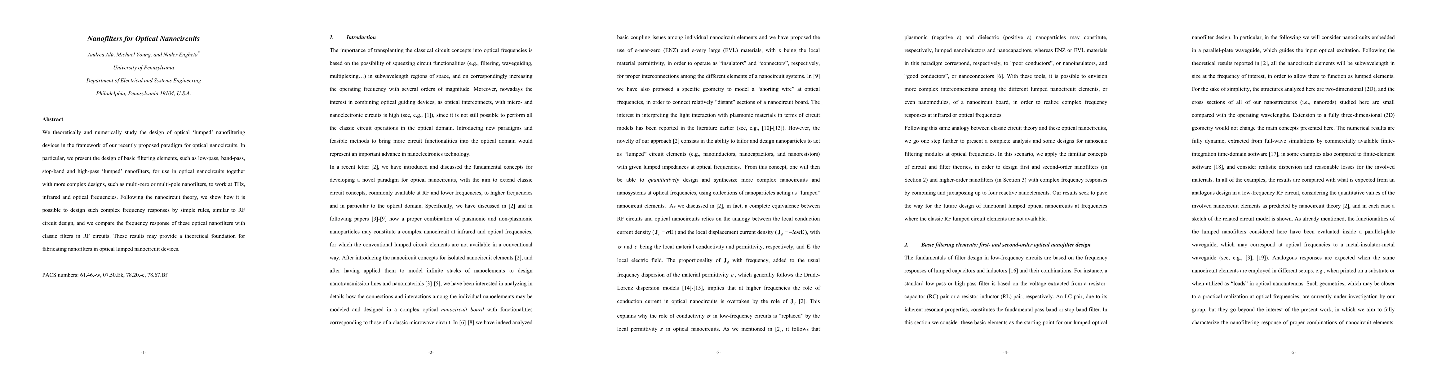 We theoretically and numerically study the design of optical 'lumped' nanofiltering devices in the framework of our recently proposed paradigm for optical nanocircuits. In particular, we present the design of basic filtering elements, such as low-pass, band-pass, stop-band and high-pass 'lumped' nanofilters, for use in optical nanocircuits together with more complex designs, such as multi-zero or multi-pole nanofilters, to work at THz, infrared and optical frequencies. Following the nanocircuit theory, we show how it is possible to design such complex frequency responses by simple rules, similar to RF circuit design, and we compare the frequency response of these optical nanofilters with classic filters in RF circuits. These results may provide a theoretical foundation for fabricating nanofilters in optical lumped nanocircuit devices.