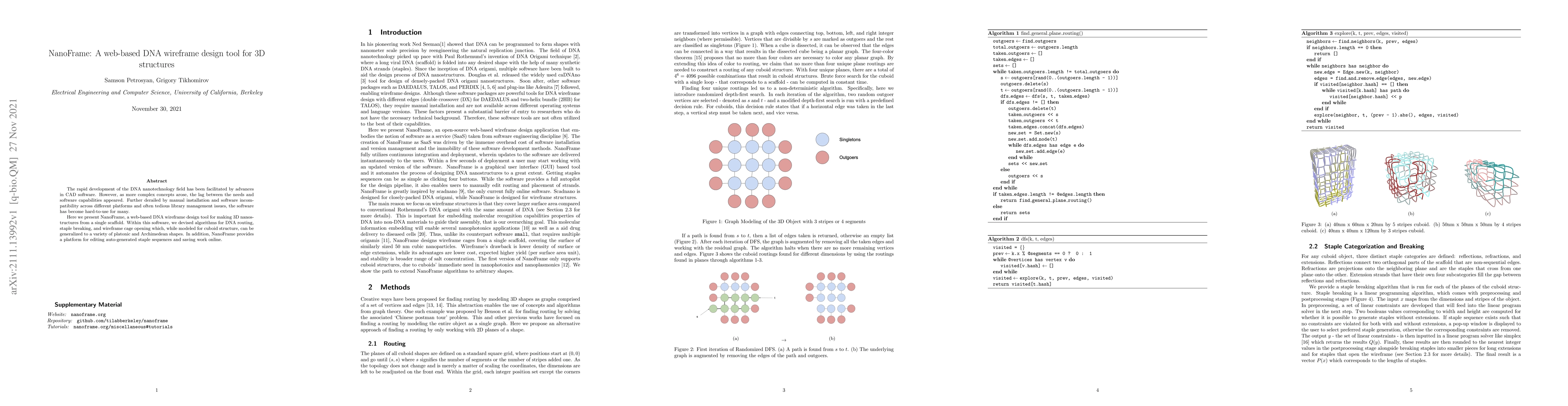 NanoFrame is a web-based tool designed to simplify the creation of 3D DNA nanostructures by addressing software incompatibility and usability issues. It features algorithms for DNA routing and scaffold editing, and supports a range of geometric shapes beyond simple cuboids.