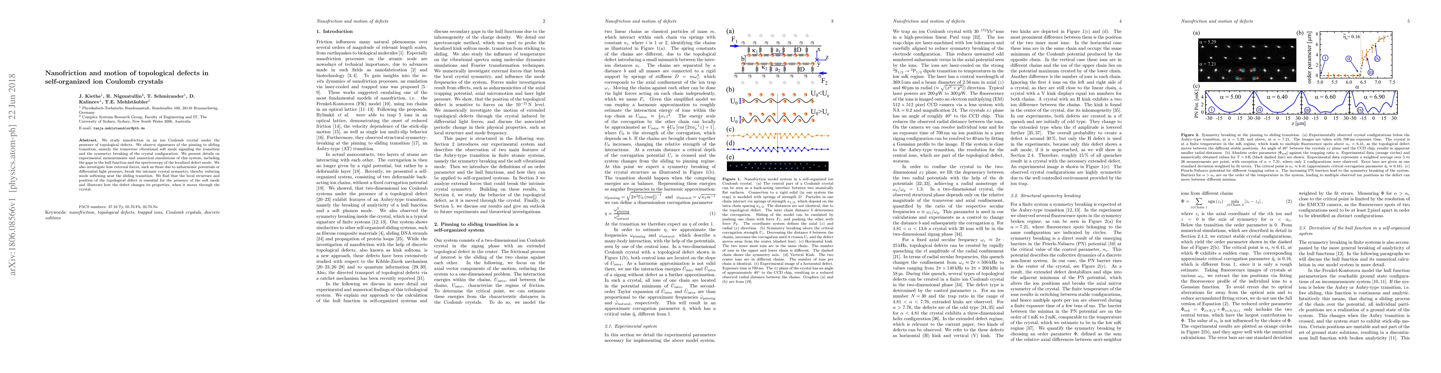 The research employs both experimental measurements and numerical simulations, including two-dimensional calculations using time-averaged RF potential without temperature and three-dimensional calculations using time-averaged RF potential with temperature. These methods are used to study nanofriction in ion Coulomb crystals with topological defects.