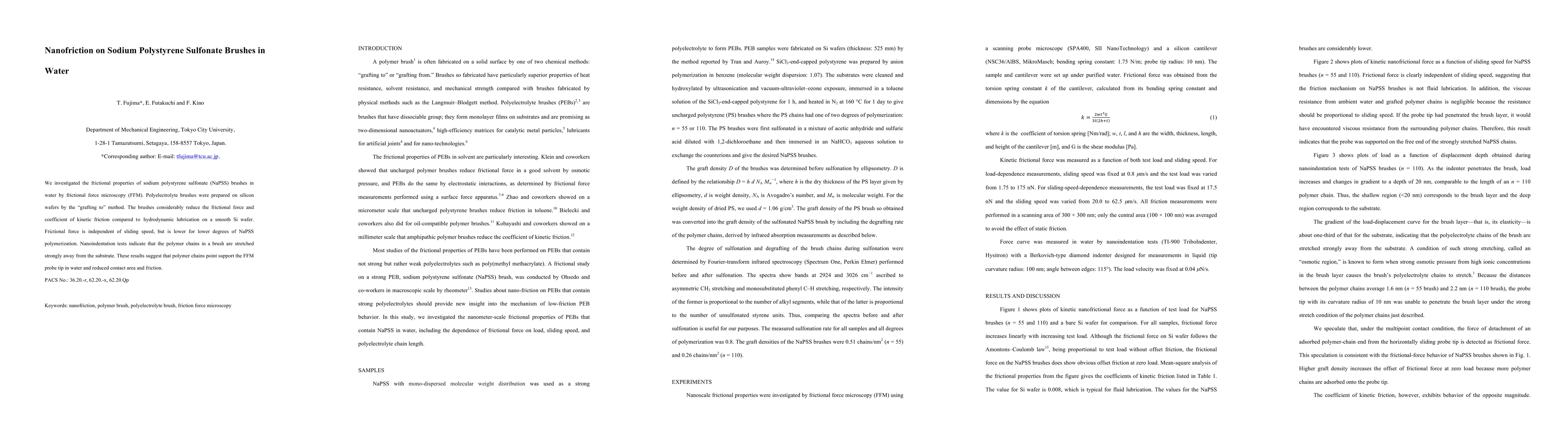 This study uses frictional force microscopy to examine sodium polystyrene sulfonate (NaPSS) brushes in water, finding they significantly reduce friction compared to smooth silicon wafers. The frictional force remains constant with sliding speed and is lower for less polymerized NaPSS, indicating that stretched polymer chains reduce contact area and friction.