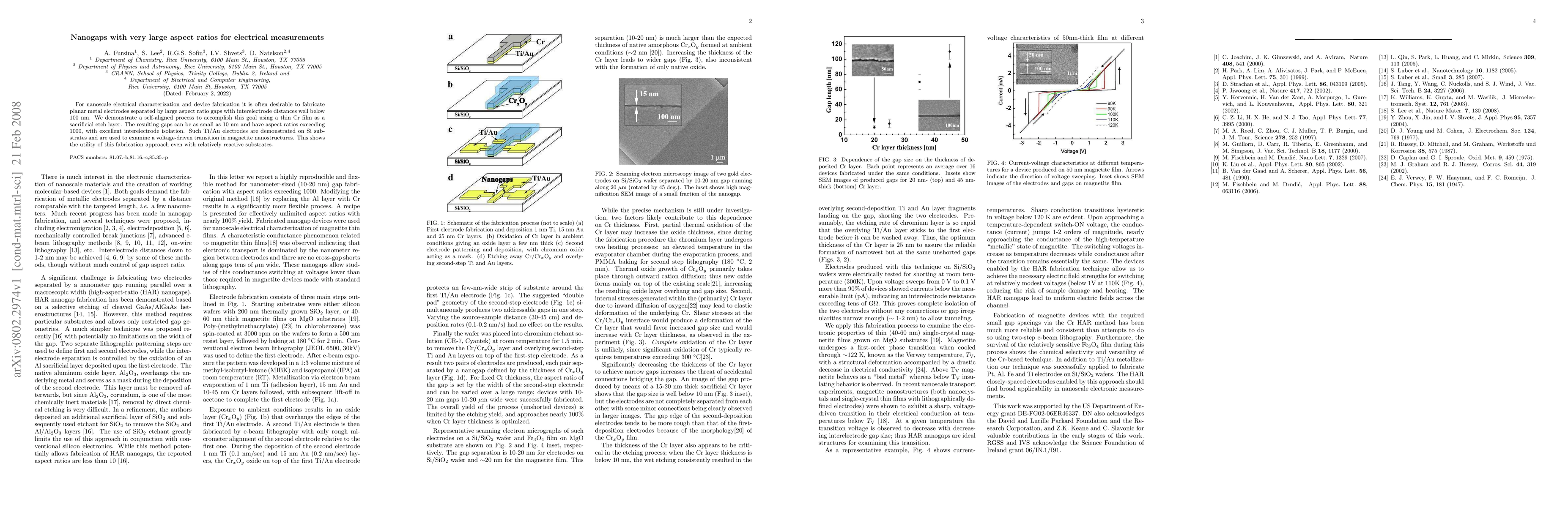 This research introduces a self-aligned process using a thin Cr film to fabricate planar metal electrodes with large aspect ratio gaps (<100 nm). The method successfully creates 10 nm gaps with aspect ratios >1000, demonstrated on Si substrates, and applies this to study voltage-driven transitions in magnetite nanostructures.