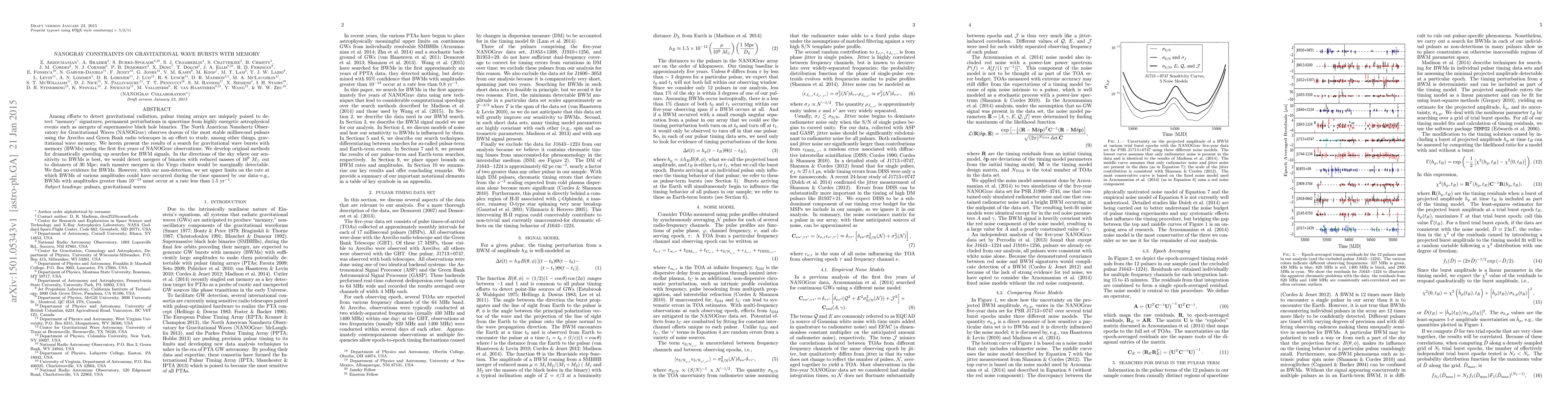 Among efforts to detect gravitational radiation, pulsar timing arrays are uniquely poised to detect "memory" signatures, permanent perturbations in spacetime from highly energetic astrophysical events such as mergers of supermassive black hole binaries. The North American Nanohertz Observatory for Gravitational Waves (NANOGrav) observes dozens of the most stable millisecond pulsars using the Arecibo and Green Bank radio telescopes in an effort to study, among other things, gravitational wave memory. We herein present the results of a search for gravitational wave bursts with memory (BWMs) using the first five years of NANOGrav observations. We develop original methods for dramatically speeding up searches for BWM signals. In the directions of the sky where our sensitivity to BWMs is best, we would detect mergers of binaries with reduced masses of $10^9$ $M_\odot$ out to distances of 30 Mpc; such massive mergers in the Virgo cluster would be marginally detectable. We find no evidence for BWMs. However, with our non-detection, we set upper limits on the rate at which BWMs of various amplitudes could have occurred during the time spanned by our data--e.g., BWMs with amplitudes greater than $10^{-13}$ must occur at a rate less than 1.5 yr$^{-1}$.