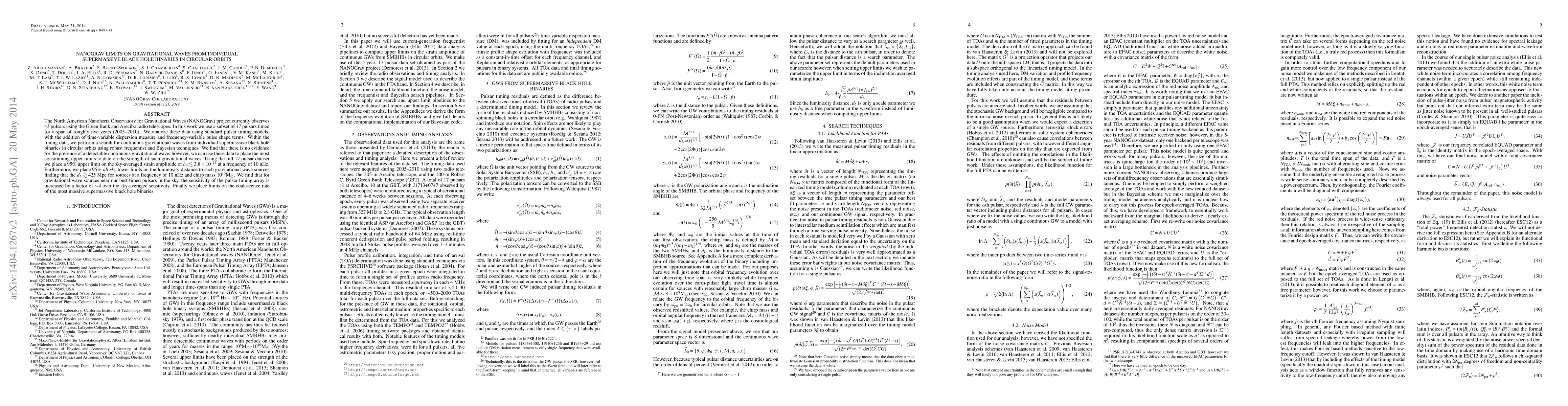 The NANOGrav project analyzed 17 pulsars' data from 2005-2010 to search for continuous gravitational waves from supermassive black hole binaries, finding no evidence but placing stringent upper limits on their strength and luminosity distance. The most stringent limit found was $h_0\lesssim 3.8\times 10^{-14}$ at 10 nHz.
