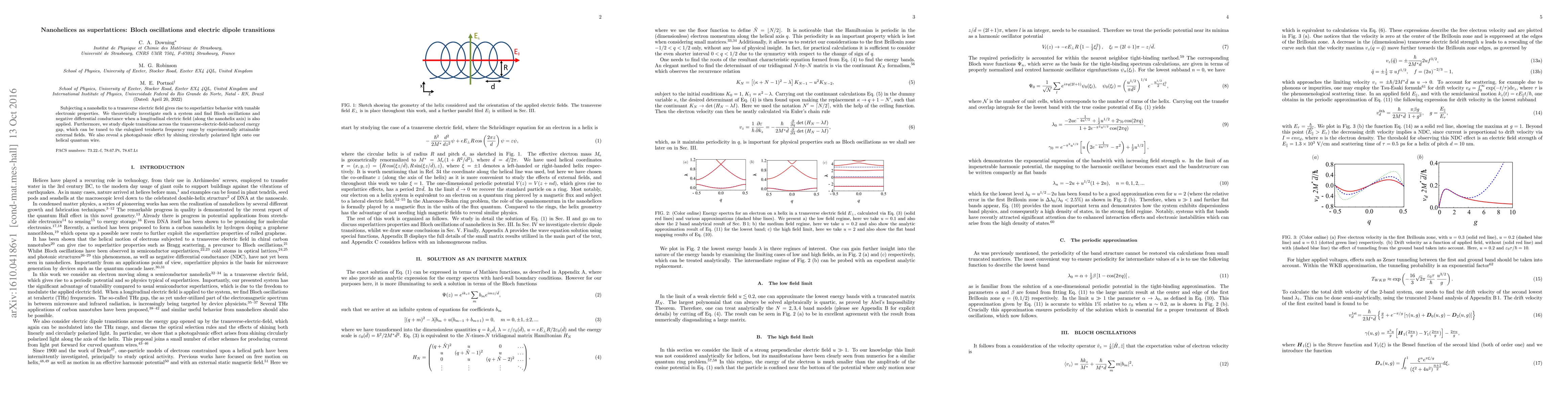 This paper investigates nanohelices subjected to transverse electric fields, revealing superlattice behavior and tunable electronic properties. The study finds Bloch oscillations and negative differential conductance under longitudinal electric fields, along with tunable terahertz dipole transitions and a photogalvanic effect from circularly polarized light.