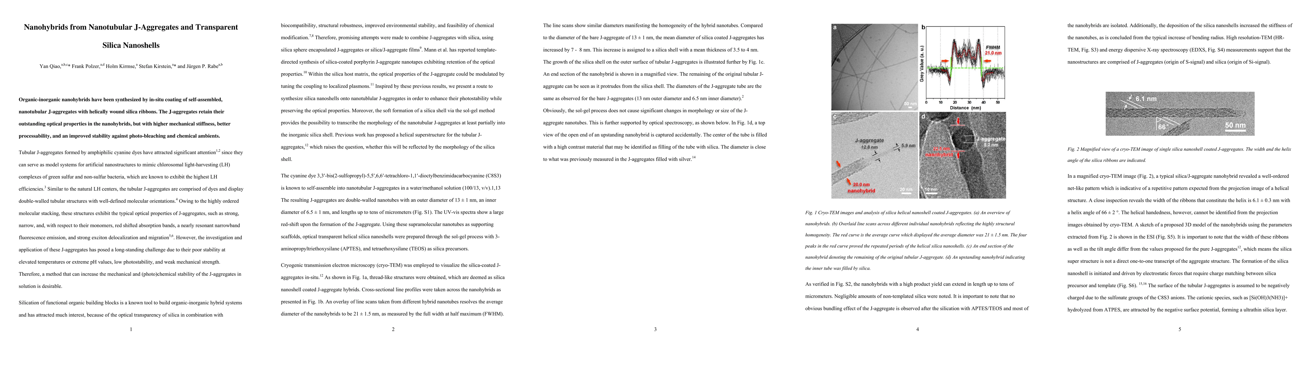 Organic-inorganic nanohybrids have been synthesized by in-situ coating of self-assembled, nanotubular J-aggregates with helically wound silica ribbons. The J-aggregates retain their outstanding optical properties in the nanohybrids, but with higher mechanical stiffness, better processability, and an improved stability against photo-bleaching and chemical ambients.