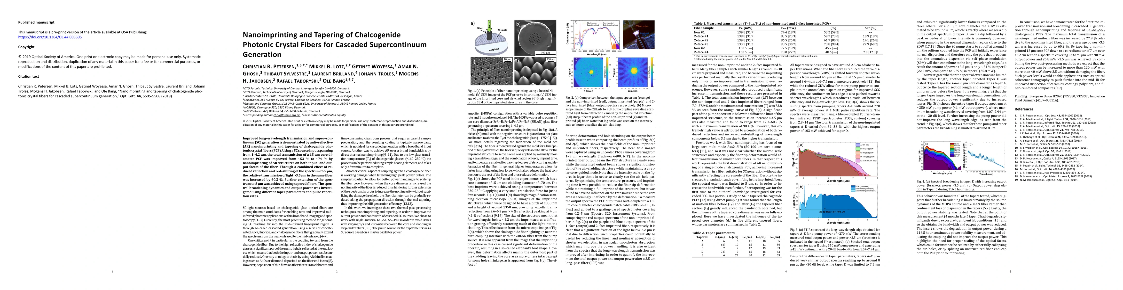 This paper demonstrates enhanced long-wavelength transmission and supercontinuum generation in chalcogenide photonic crystal fibers via anti-reflective nanoimprinting and tapering, achieving a 60.2% increase in transmission for wavelengths >3.5 μm and extending the spectrum to 8 μm.