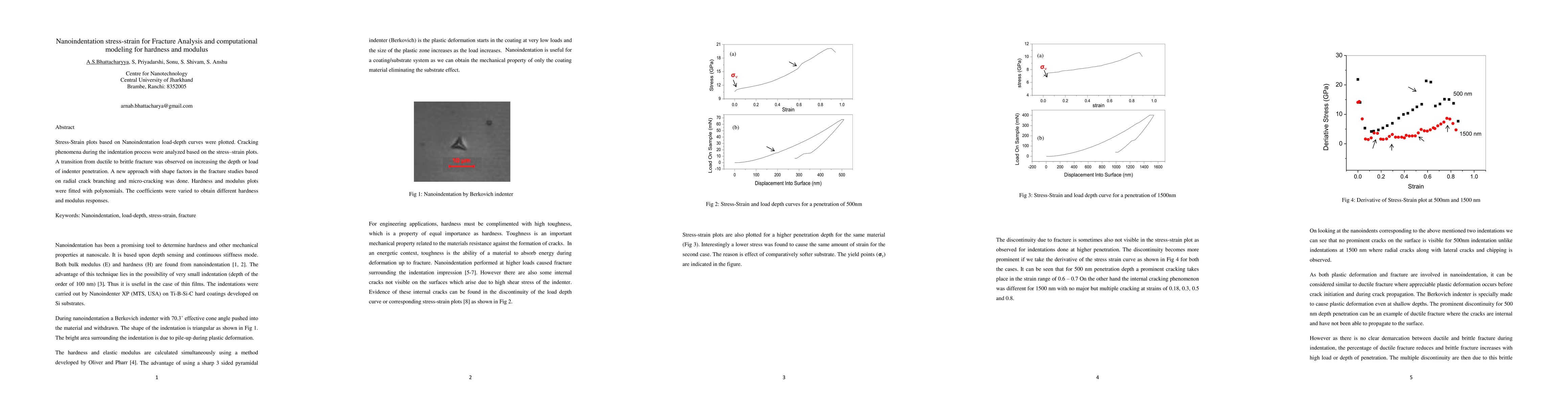 Stress-strain plots based on nanoindentation load-depth curves reflected cracking phenomenon. A transition from ductile to brittle fracture was observed on increasing the depth or load of indenter penetration. A new approach with shape factors in the fracture studies based on radial crack branching and micro-cracking was done. Hardness and modulus plots were fitted with polynomials. The coefficients were varied to obtain different hardness and modulus responses.