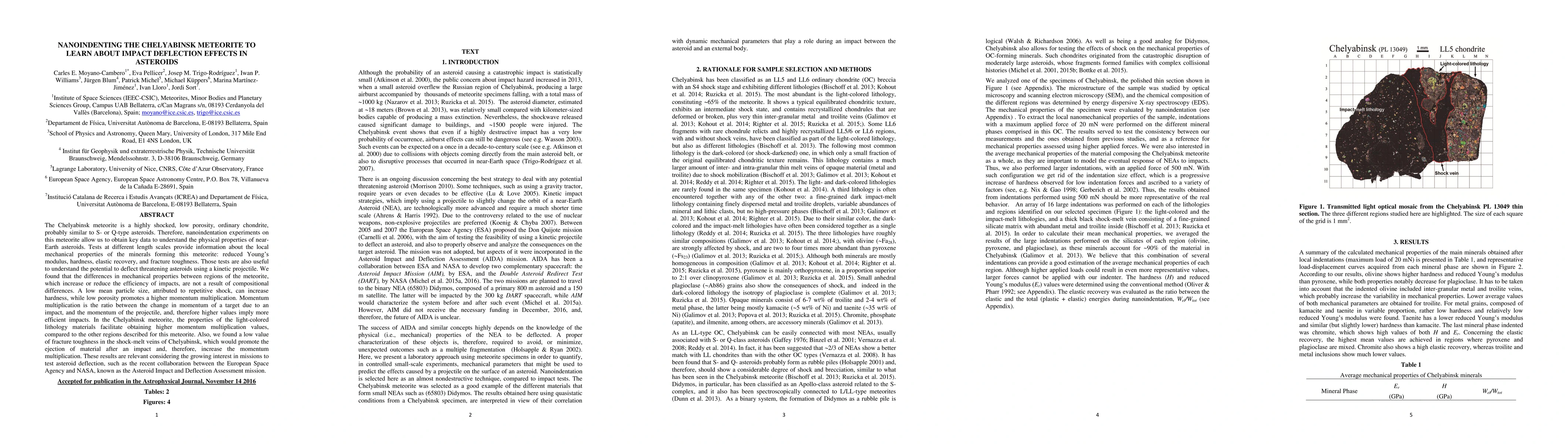 This study uses nanoindentation on the Chelyabinsk meteorite to investigate the mechanical properties of near-Earth asteroids, focusing on reduced Young's modulus, hardness, and fracture toughness. The findings suggest that the meteorite's light-colored lithology materials can achieve higher momentum multiplication, enhancing the efficiency of asteroid deflection strategies.