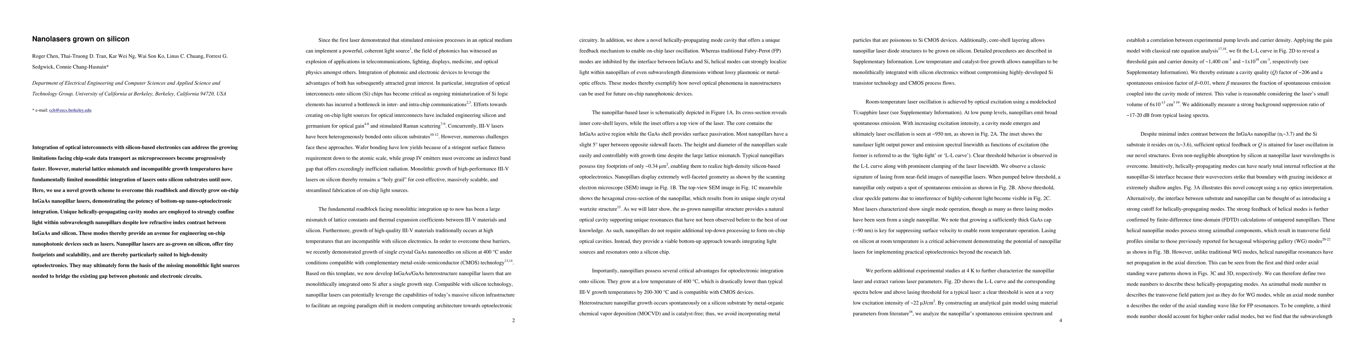 Researchers have successfully grown nanolasers on silicon using a novel growth scheme, overcoming material lattice mismatch and temperature limitations. The discovery paves the way for the integration of optical interconnects with electronics and could lead to high-density optoelectronics.
